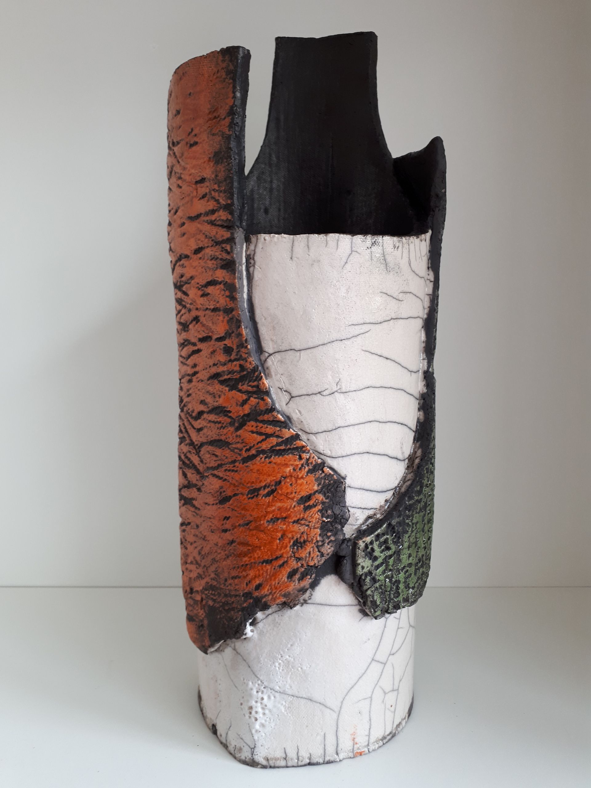 Raku gestookt met groene, oranje en witte raku glazuur
