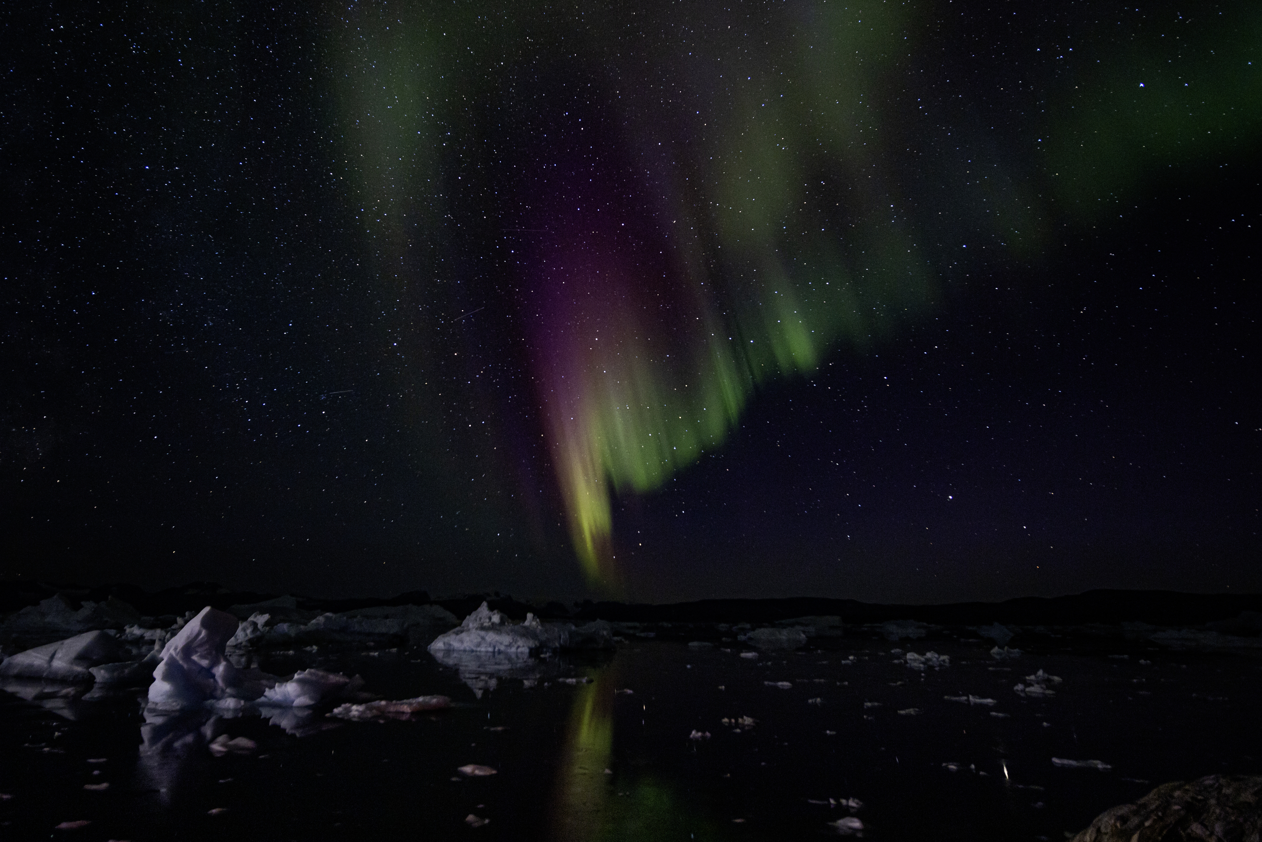 Dancing aurora tussen ijsschotsen in het Sermilik Fjord; oost Groenland