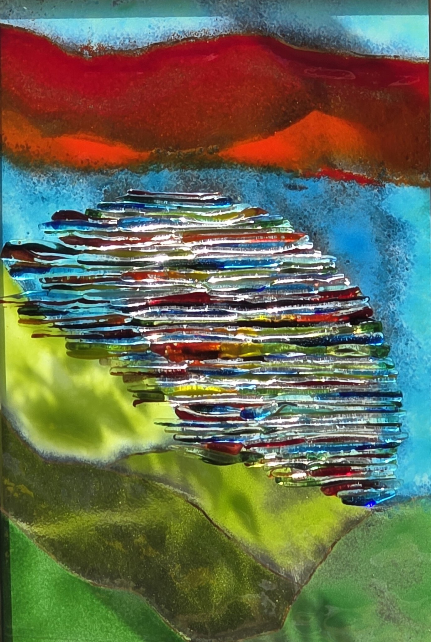 Na een fikse storm, lag een eerder gemaakt werk in stukken. En natuurlijk gooi je geen splintertje glas weg, maar zoek je naar een manier om te herbruiken. De kleinste scherven tot fritt en poeders gestampt en de grotere stukken versneden en opnieuw gefused. Het eindresultaat samen gesmolten en hier en daar en 18krt. gouden accent. Bovenop een meerpaal bevestigd in een stevige lijst.