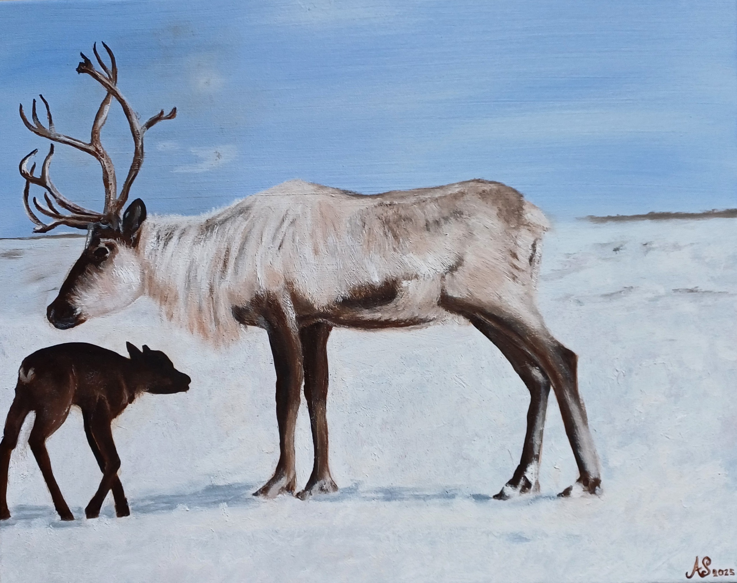 Dit is het 3e werk in een serie van 3 met als thema "rendieren". Mijn inspiratie komt van een televisieserie "het Hoge Noorden", waarin o.a. Noorwegen wordt bezocht, waar de rendieren nog vrij rond lopen. Dit moeder rendier blijft dicht bij haar nieuwe jonge kalfje met zijn lange wankele pootjes. Ze lijkt naar het kalf toe te buigen om haar te beschermen.