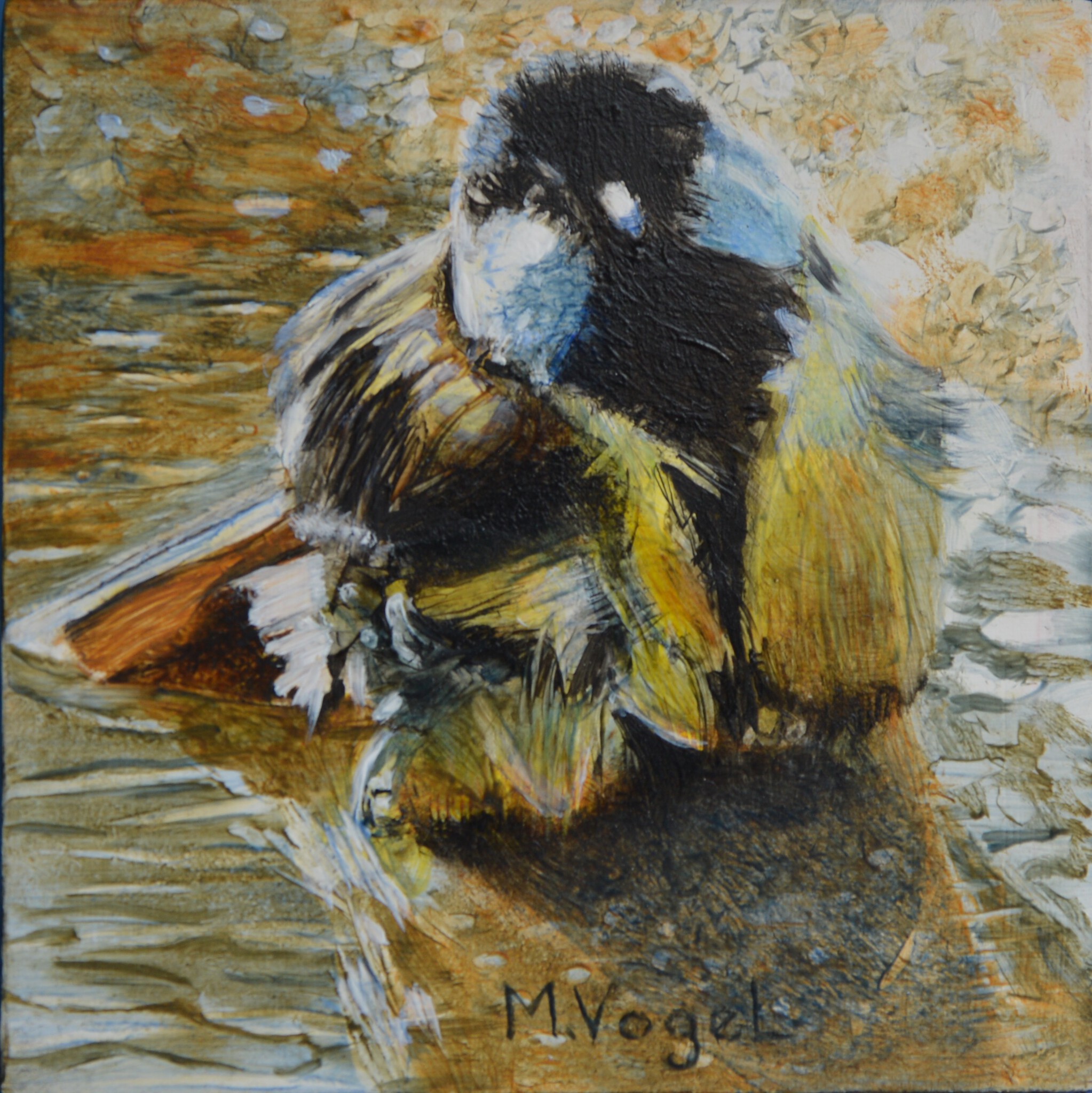 Geel Zwart Vogel Yellow Water Dier Olieverf Oilpaint Natuur Black Bird Koolmees Bad Nature Animal Tit Bath Coal Glaceerwerk Glacing