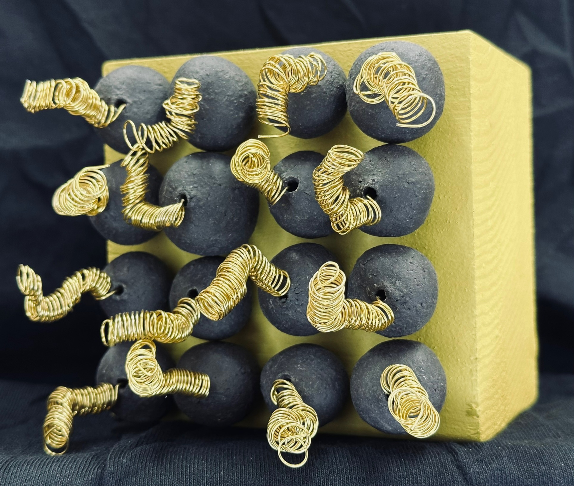 Bolletjes van zwartbakkende klei op een houten blokje.