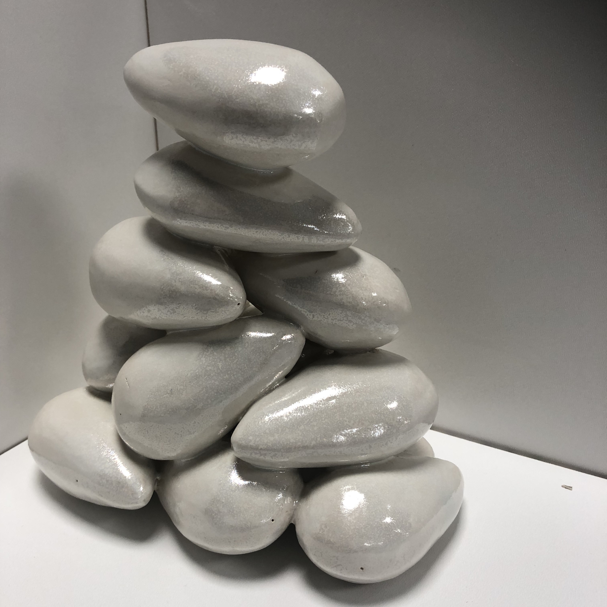 Een stapeling van vormen, afgewerkt met een glazuur met schelpenluster effect.