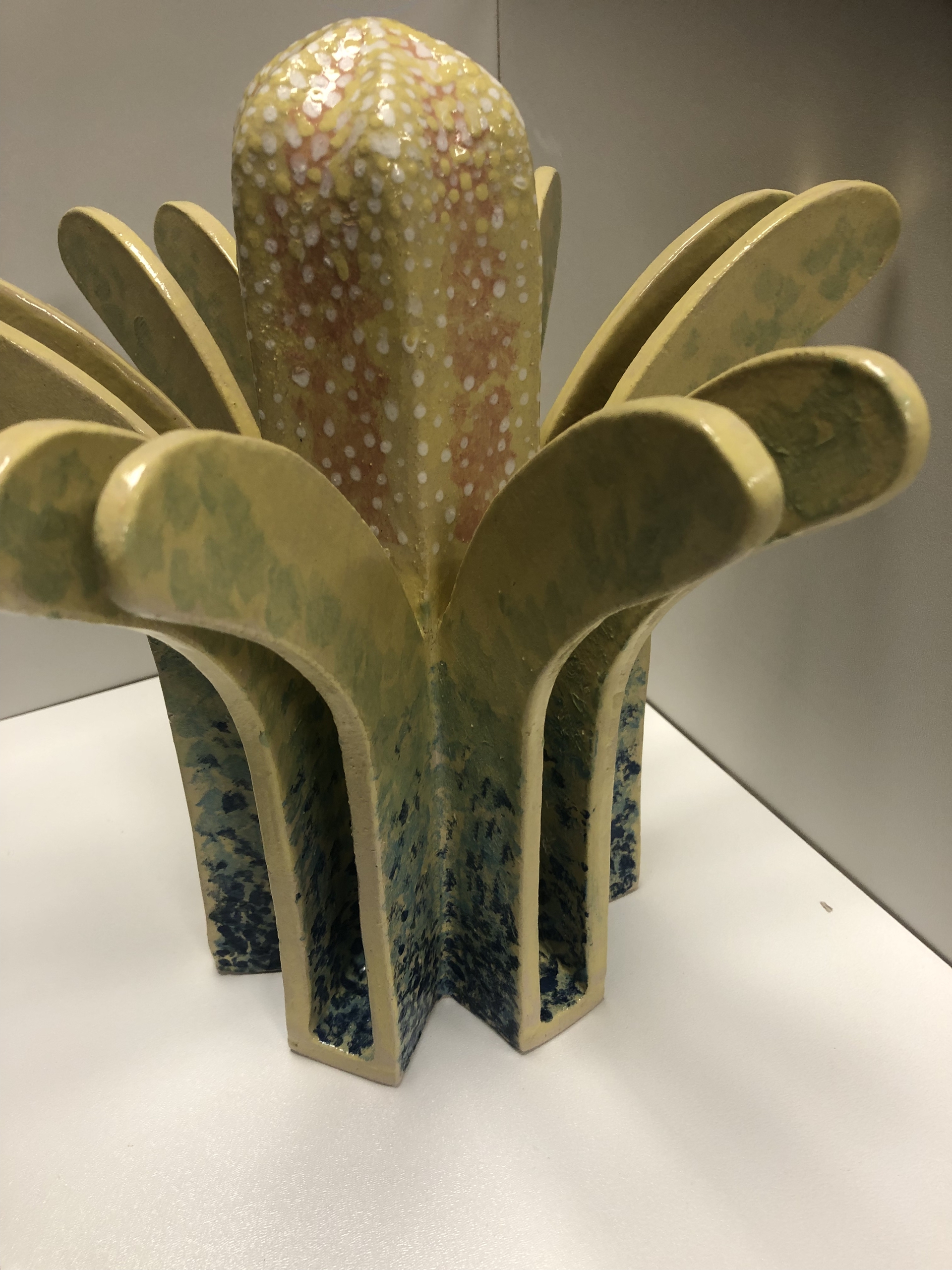 Een bouwwerk in bloemvorm, afgewerkt met engobes en glazuur.