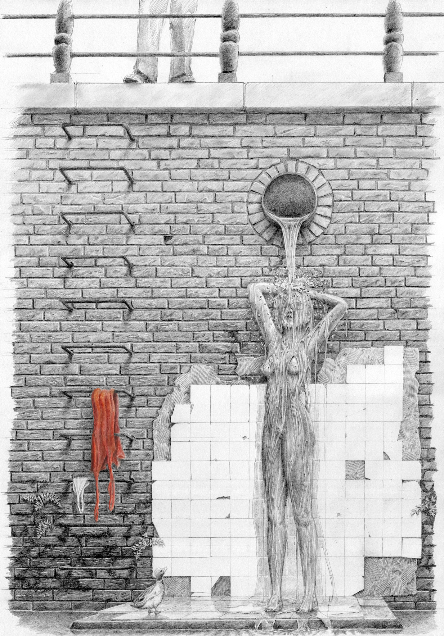 Op een verweerd plateau in een gracht staat een naakte vrouw zich onbevangen te douchen onder een straal water, wat lijkt te komen uit een afvoerpijp. Vreemd! Dit lijken ook twee toeschouwers te vinden.