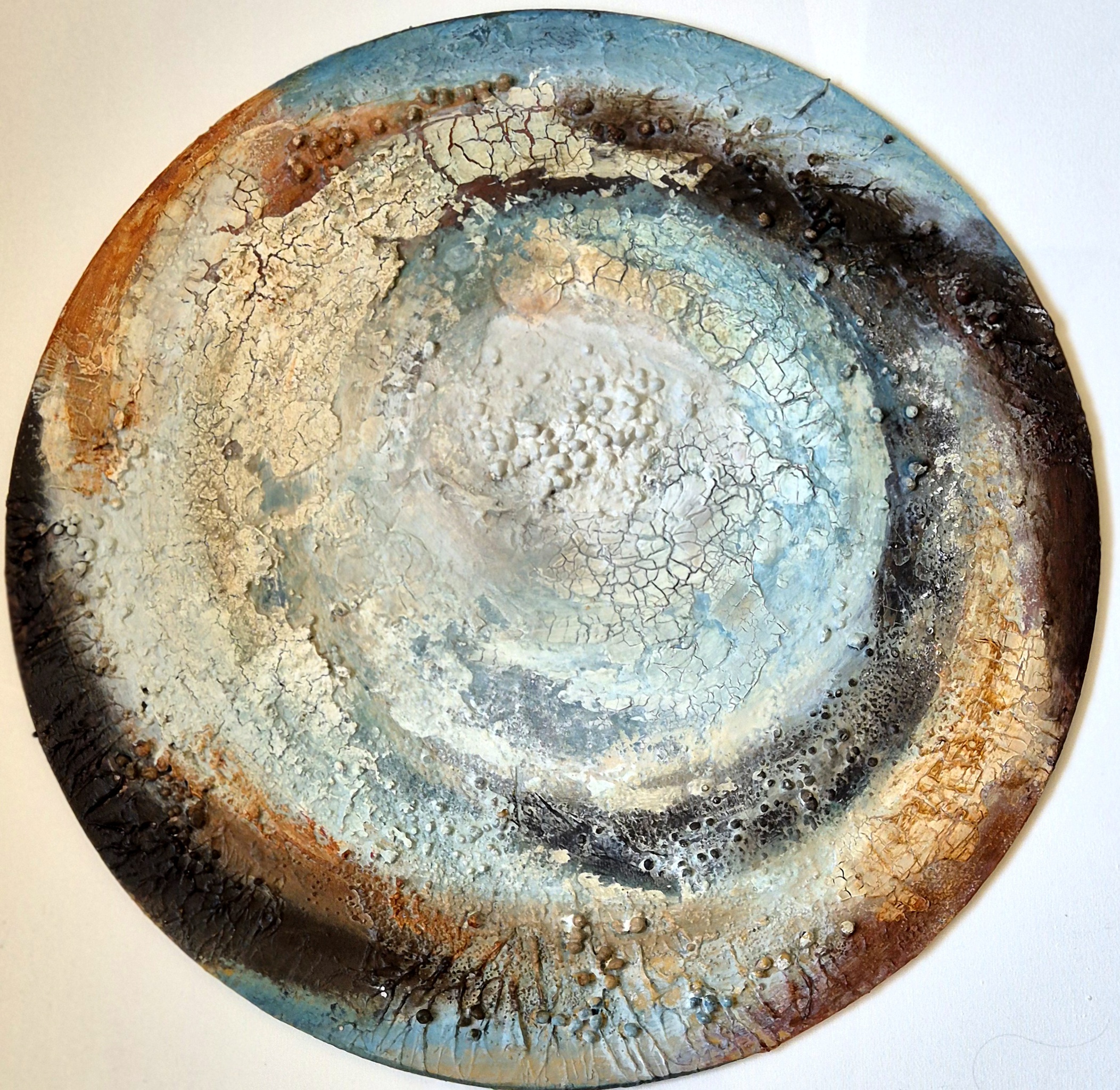 Een rond schilderij op paneel, geinspireerd door de natuur.