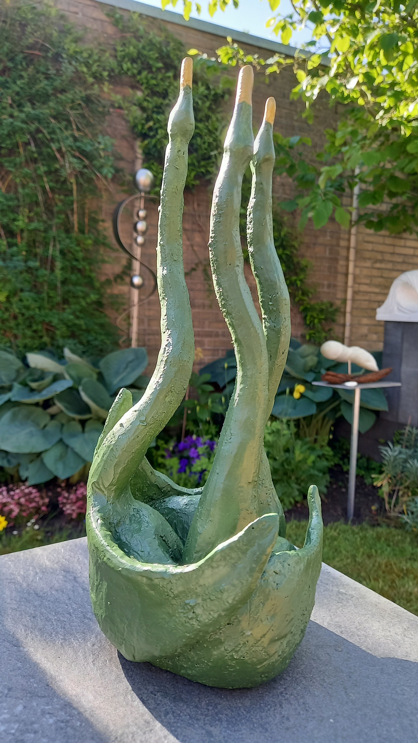 Drie vogelachtige figuren die samen in gesprek zijn. Geboetseerd in witbakkende klei met grove chamotte als stap in het maken van een vergelijkbaar beeldje gemaakt van albast. Zie de sectie Beelden in steen van deze site. Na het bakproces is het beeldje met acrylverf bejandeld, olijfgroen en goudkleurig. Het is, wat ik noem, een relatie beeldje. Om bijvoorbeeld kado te doen in een situatie waarbij met elkaar in gesprek blijven belangrijk is of was.