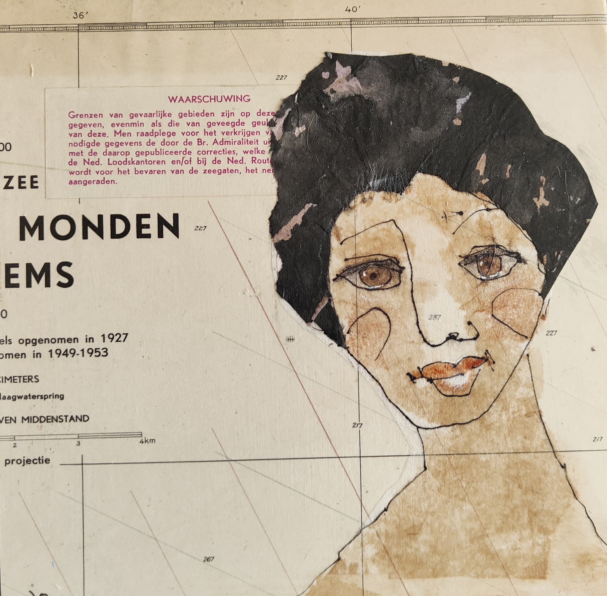 Serie van 12. Collage eigen werk, monoprint, tekenen op oude wadden vaarkaart uit 1957, gevonden bij een kringloopwinkel