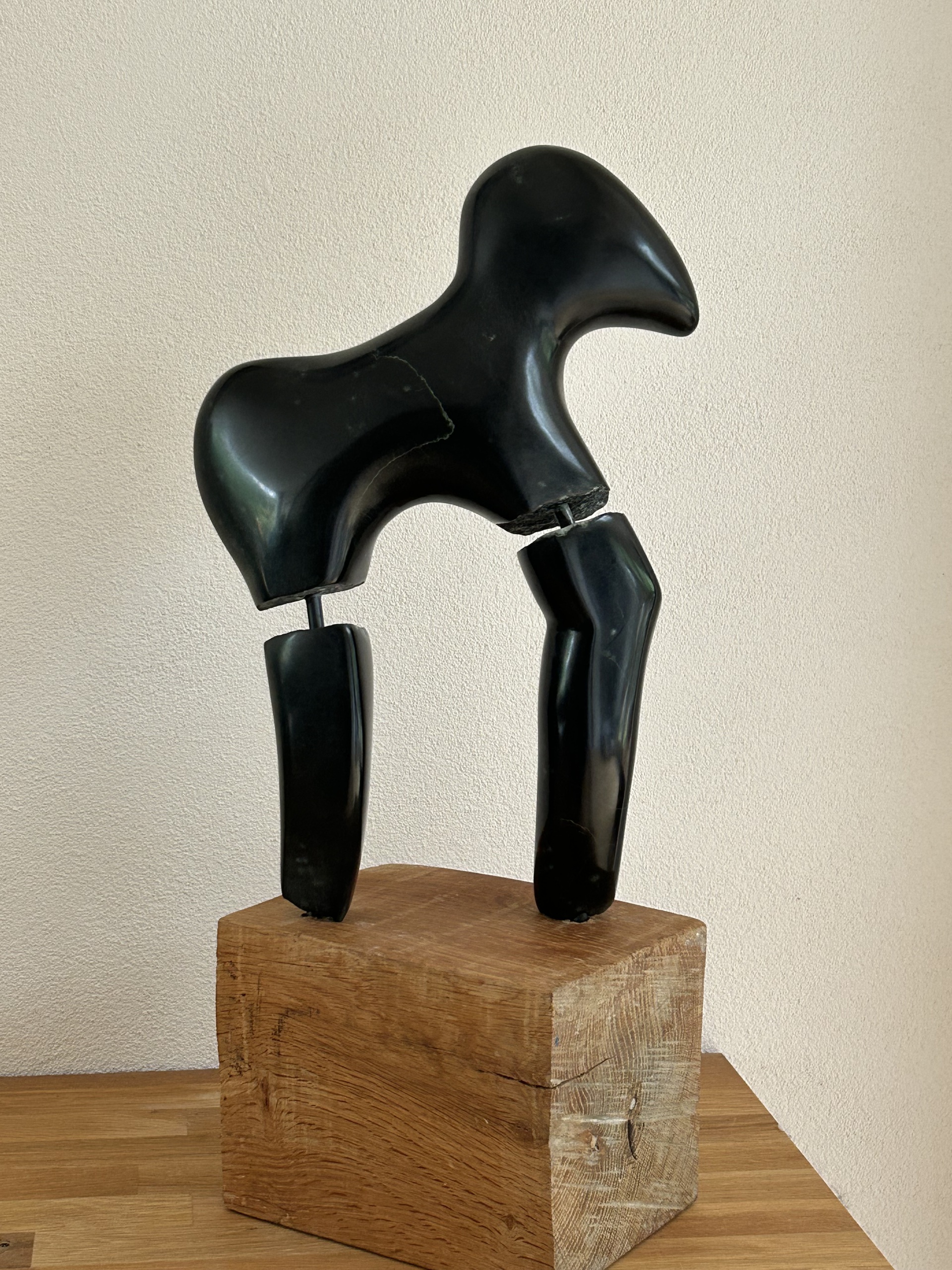 Bij dit beeld is de breuk die in de steen optrad onderdeel geworden van het beeld. De steen is diepzwart glanzend. Het is een soort oerpaard in een beweeglijke stand op een eikenhouten sokkel.