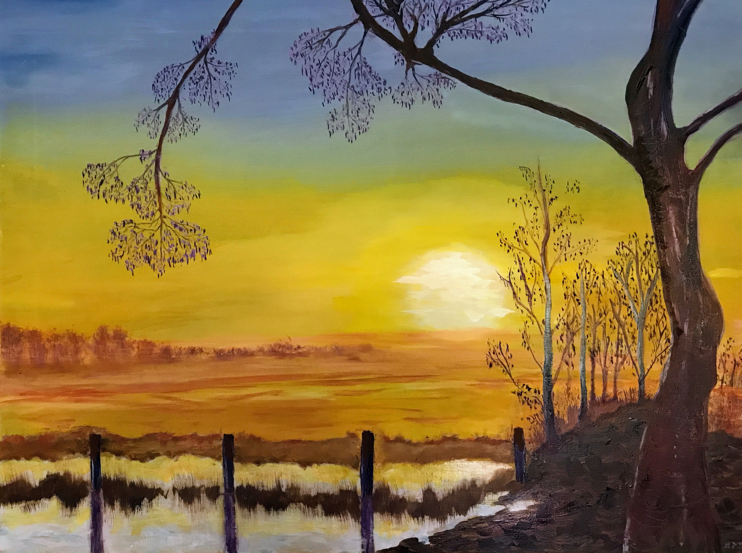 Zon Paars Olieverf Bomen Mist Impressionisme Zonsopgang Goudgeel Moeras