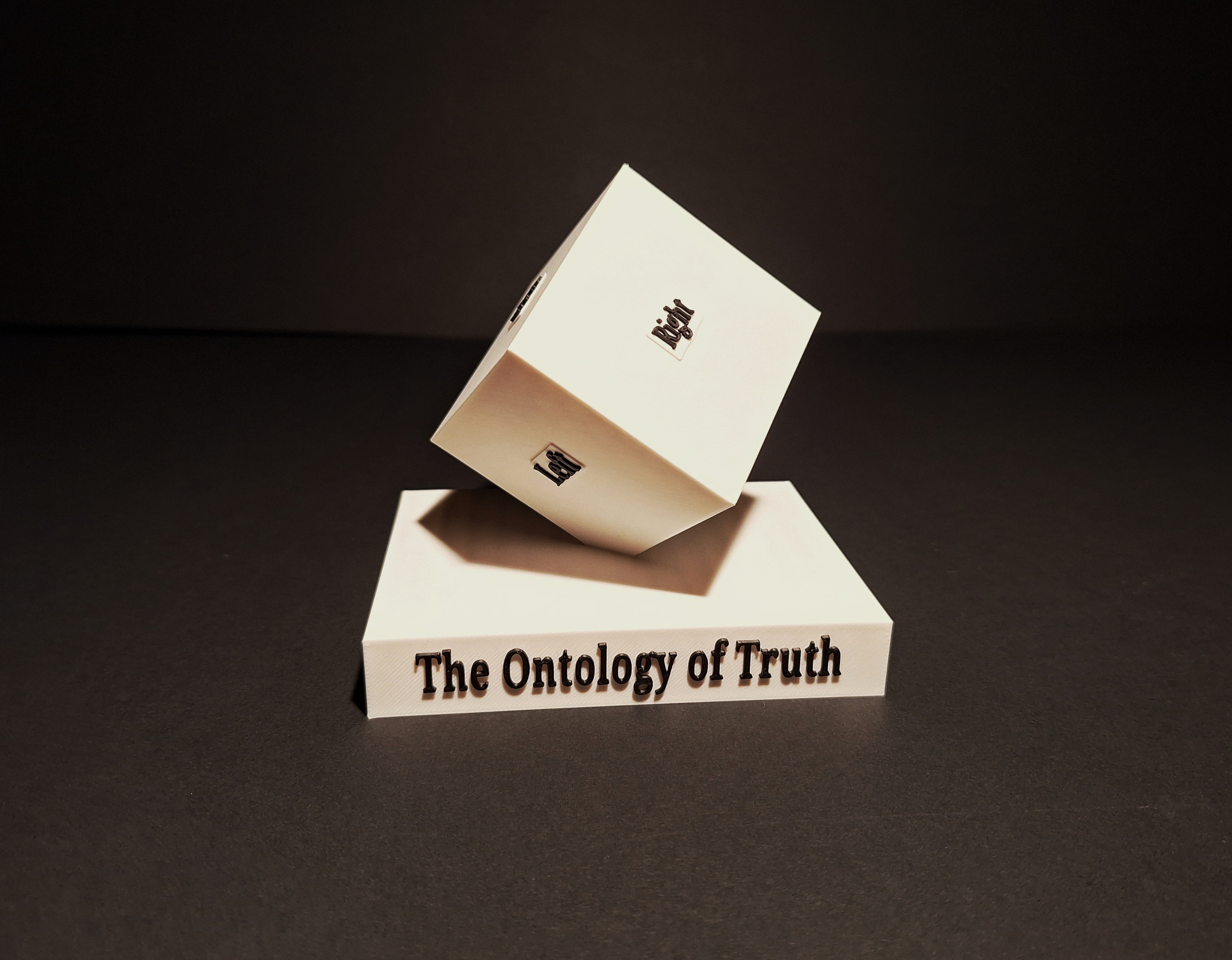 This 3D printed installation explores the instability of truth through spatial orientation and linguistic opposition. A tilted cube, marked alternately with the words left and right, rests on a base inscribed with the title The Ontology of Truth. The cube evokes structure and clarity, but the opposing inscriptions undermine this sense of order. Left and right suggest not only directions, but also ideological or moral positions. The work invites reflection on how truth is shaped by contrast, context, and perspective. The installation draws on Martin Heidegger’s concept of aletheia—truth as unconcealment. Heidegger argued that truth is not a fixed correspondence, but a dynamic event in which something emerges from hiddenness. The cube, partly lit and partly obscured, enacts this tension between revealing and concealing. Importantly, a cube never shows itself entirely: at most, three sides are visible at once, while the others remain hidden. To look at the cube is also to hide part of it. This basic geometric fact becomes a metaphor for Heidegger’s insight—every disclosure is also a concealment. By presenting the cube in a state of imbalance and partial visibility, the work suggests that truth is never fully present or complete. It must always be approached from a particular angle, in a particular light. The Ontology of Truth becomes not only a reflection on what is shown, but on all that remains hidden.