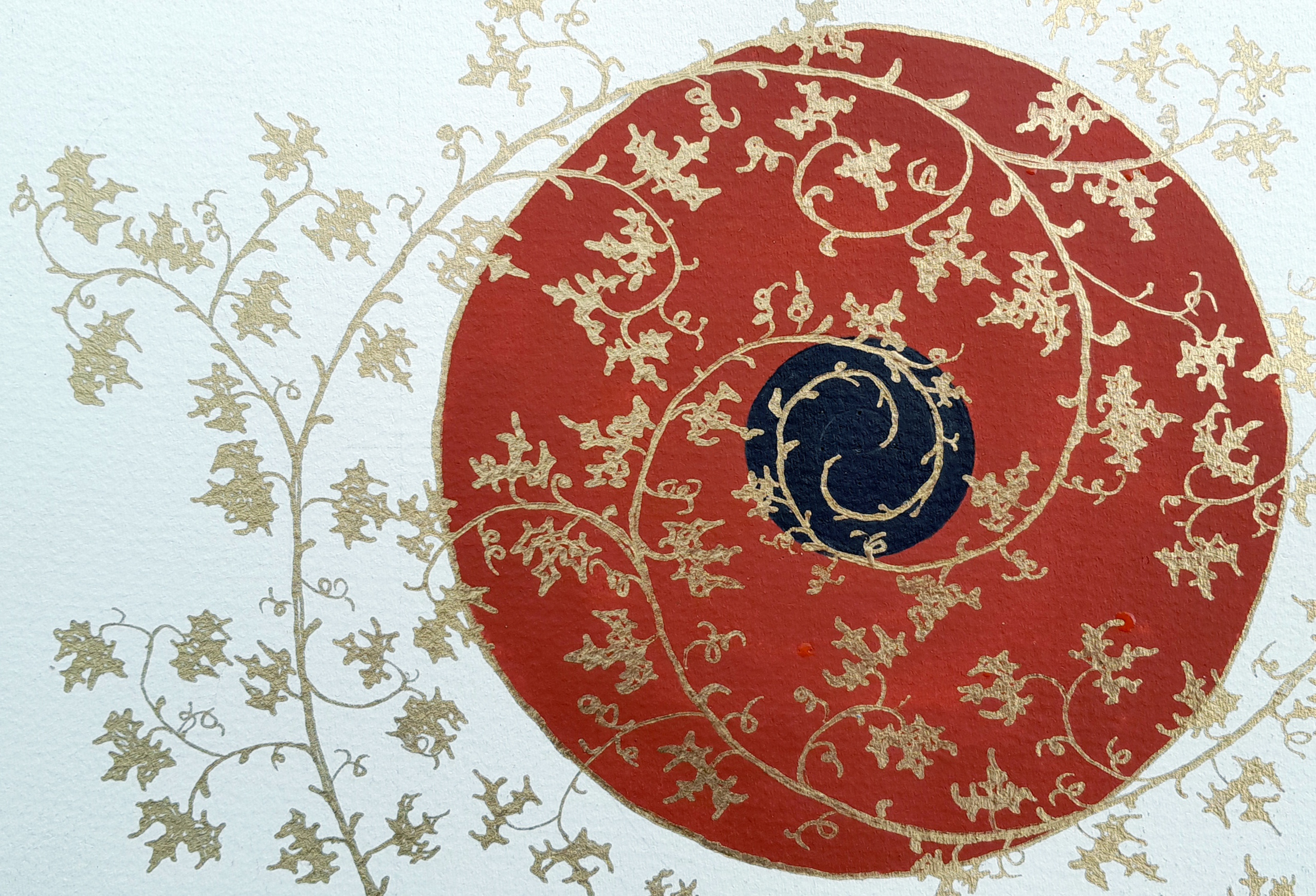 Wijnranken in een fibonaccispiraal. Gebaseerd op de randversieringen van De Gebroeders van Lymborch. Aquarelverf en goudstift op 300 grams aquarelpapier.