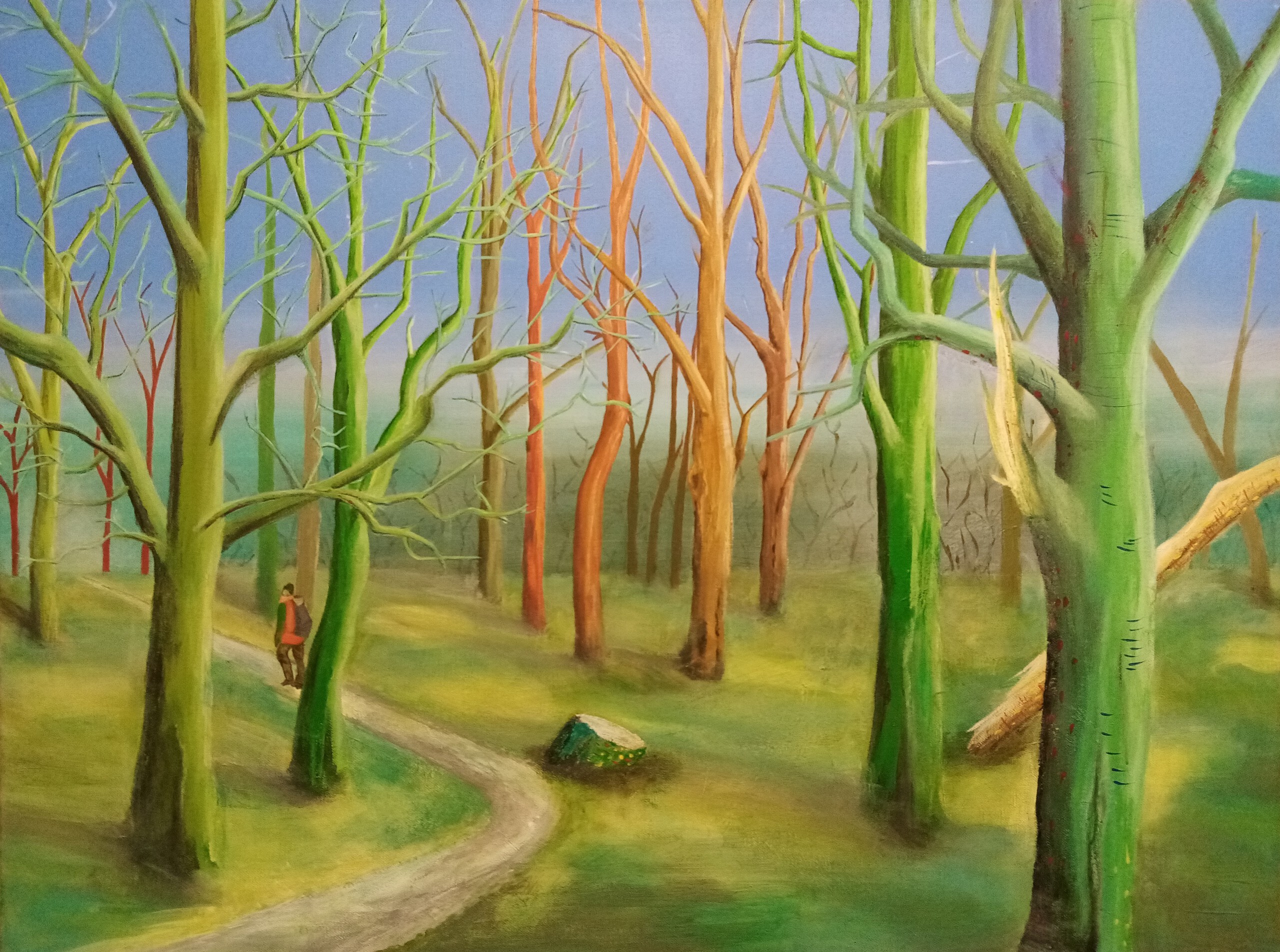 Centraal in het werk loopt een eenzame wandelaar over een slingerend pad. Die aanwezigheid geeft het landschap diepte en emotie: het menselijke verlangen naar afzondering en verbinding met het landschap.. De afwisseling tussen realistische elementen en fantasierijke kleuren maakt het werk tegelijk herkenbaar en dromerig.