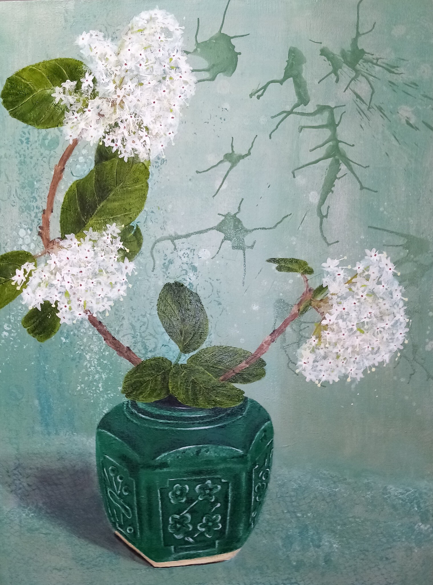 De achtergrond is gelaagd en mysterieus, opgebouwd uit doorschijnende tinten groen met abstracte vormen die doen denken aan organische structuren of verweerde muren. Dit contrast tussen figuratie en abstractie versterkt de dieptewerking.