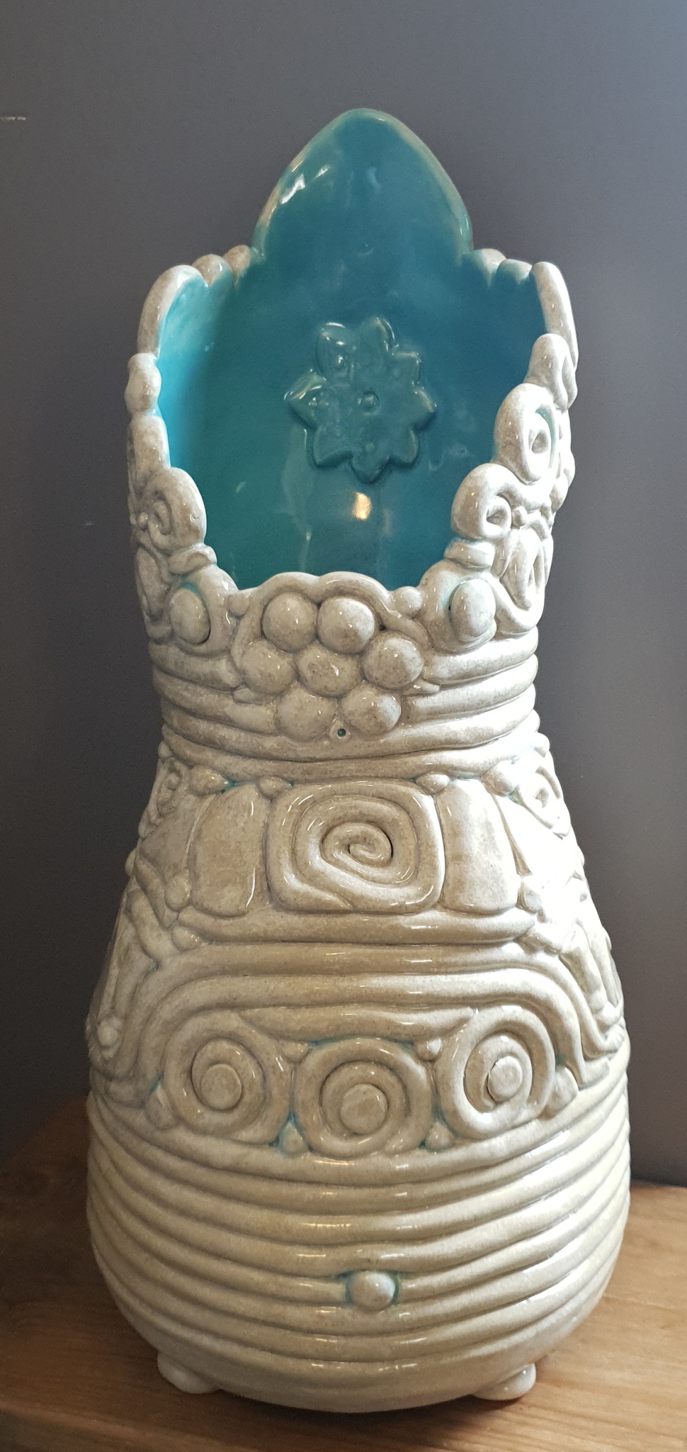 Vaas, op steengoed temperatuur gebakken , opgebouwd van rollen, creme en licht blauw geglazuurd