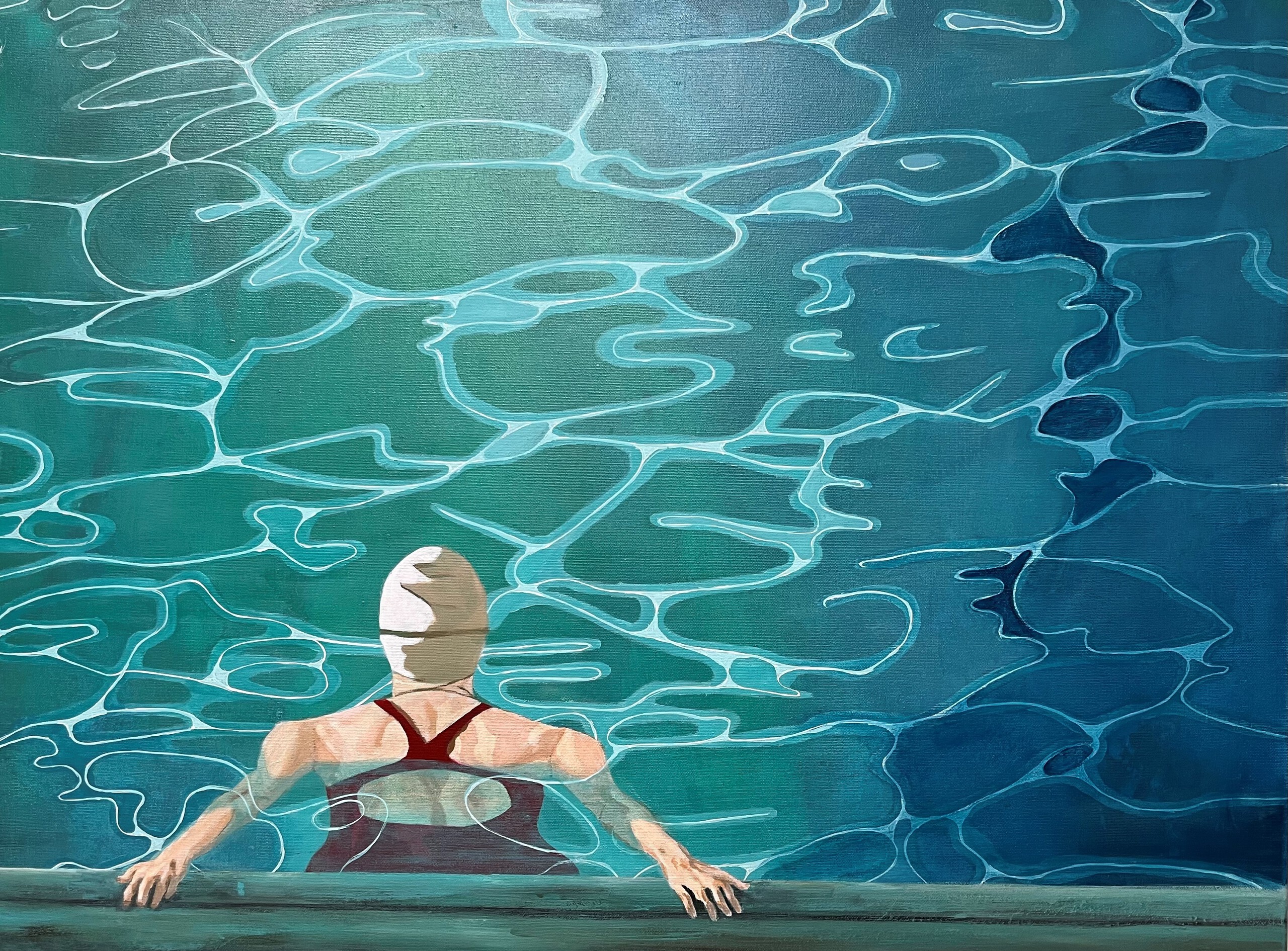 Dit schilderij vangt een universeel gevoel: het ogenblik vóór de sprong. Het moment van aarzeling, van reflectie. Van kiezen tussen blijven vasthouden of je laten drijven. Het stijlcontrast tussen het realistische lichaam en het bijna abstracte water draagt bij aan een diepere betekenis. De zwemmer symboliseert het rationele, bewuste ik, terwijl het water verwijst naar het onbewuste, het intuïtieve, het onzekere.