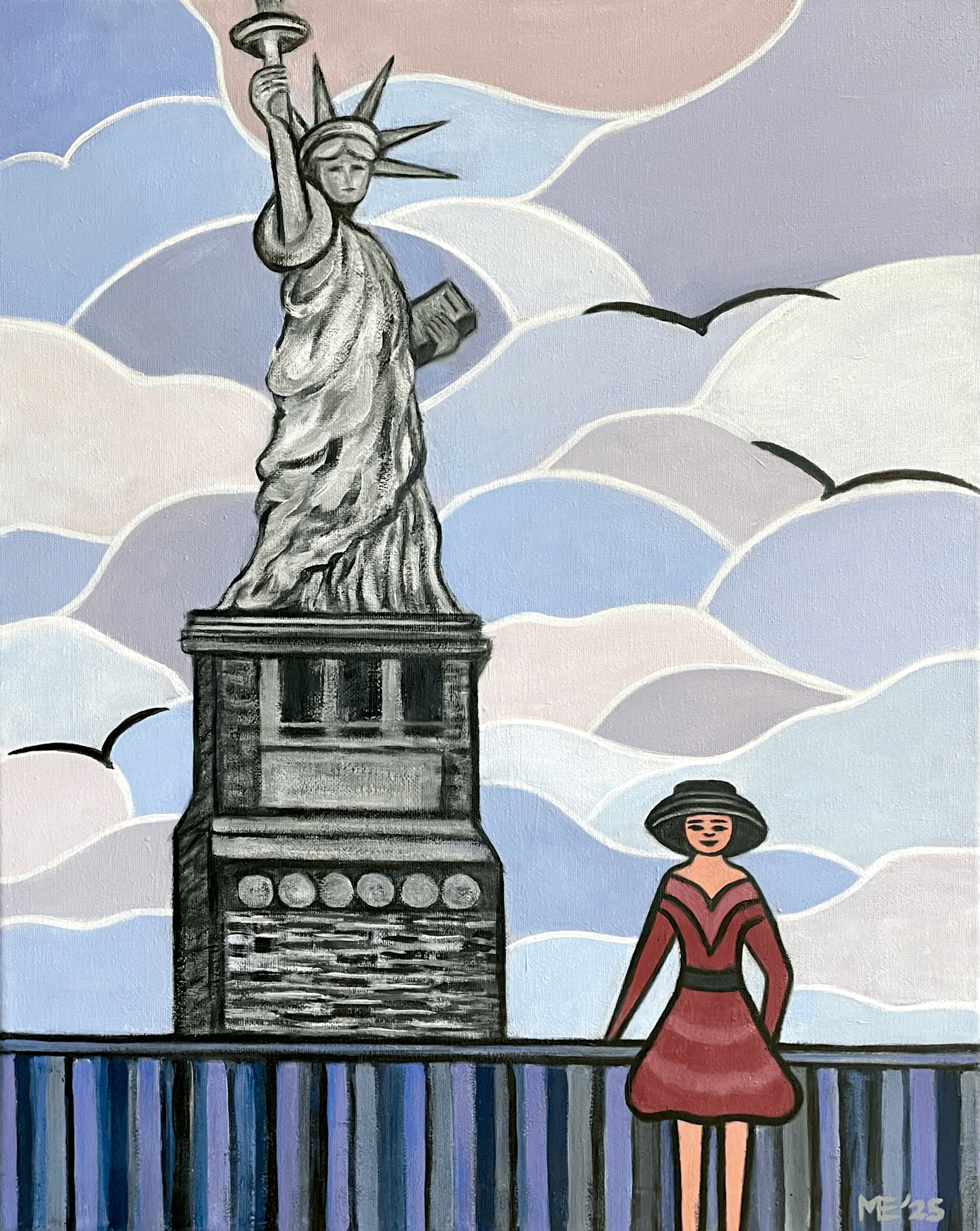 Een dame poseert bij het Vrijheidsbeeld in New York, met 'het hoofd in de wolken'. Nr. 7 alweer van deze serie van modellen bij beroemde gebouwen in wereldsteden.