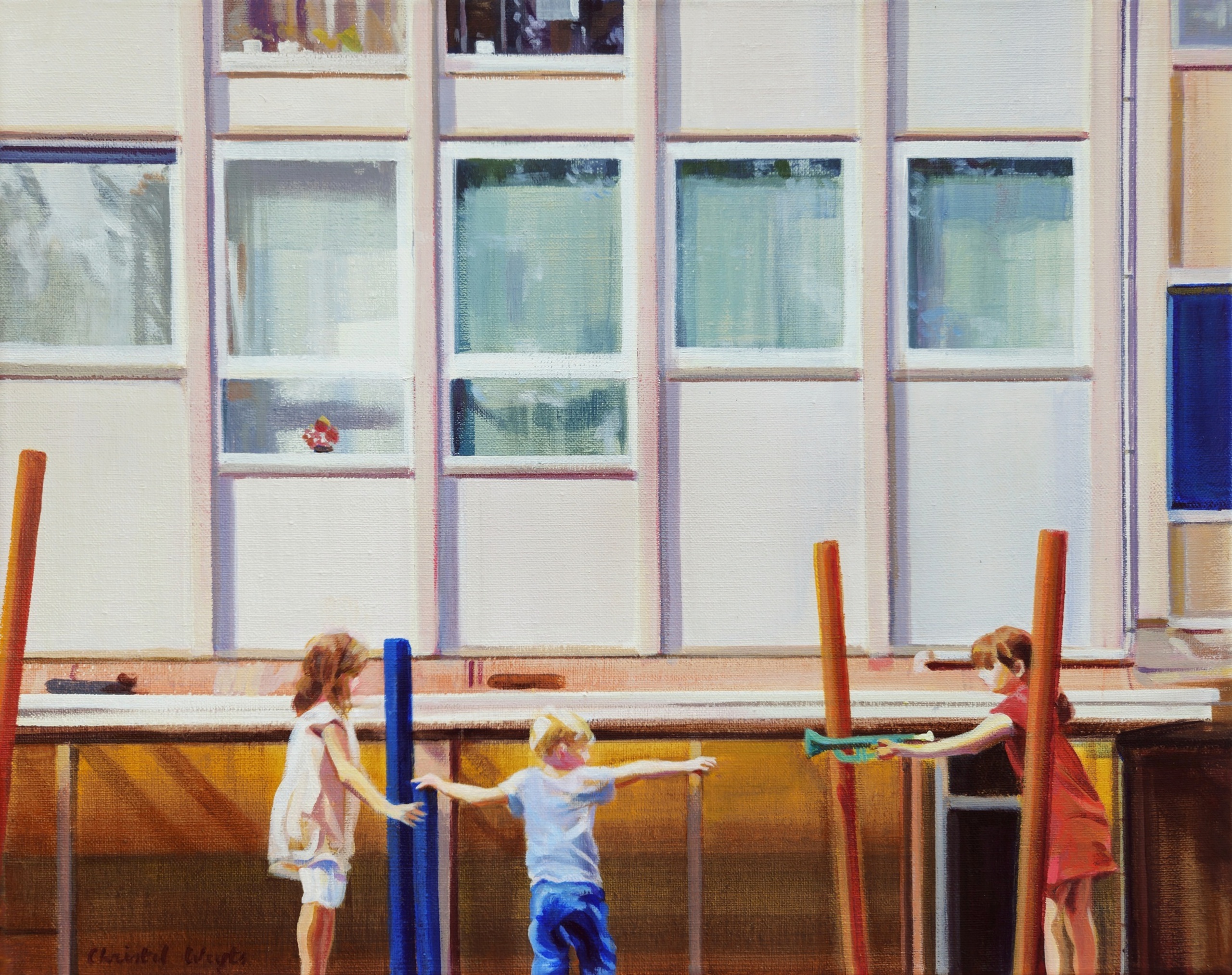 Christel Weyts maakt acrylschilderijen over de mens en zijn leefomgeving. Ze filtert taferelen die vooral het esthetische en de harmonie in een situatie willen benadrukken. Ze houdt aparte composities vast binnen de grenzen van het canvas. Licht en beweging zijn hierbij vaak belangrijk.