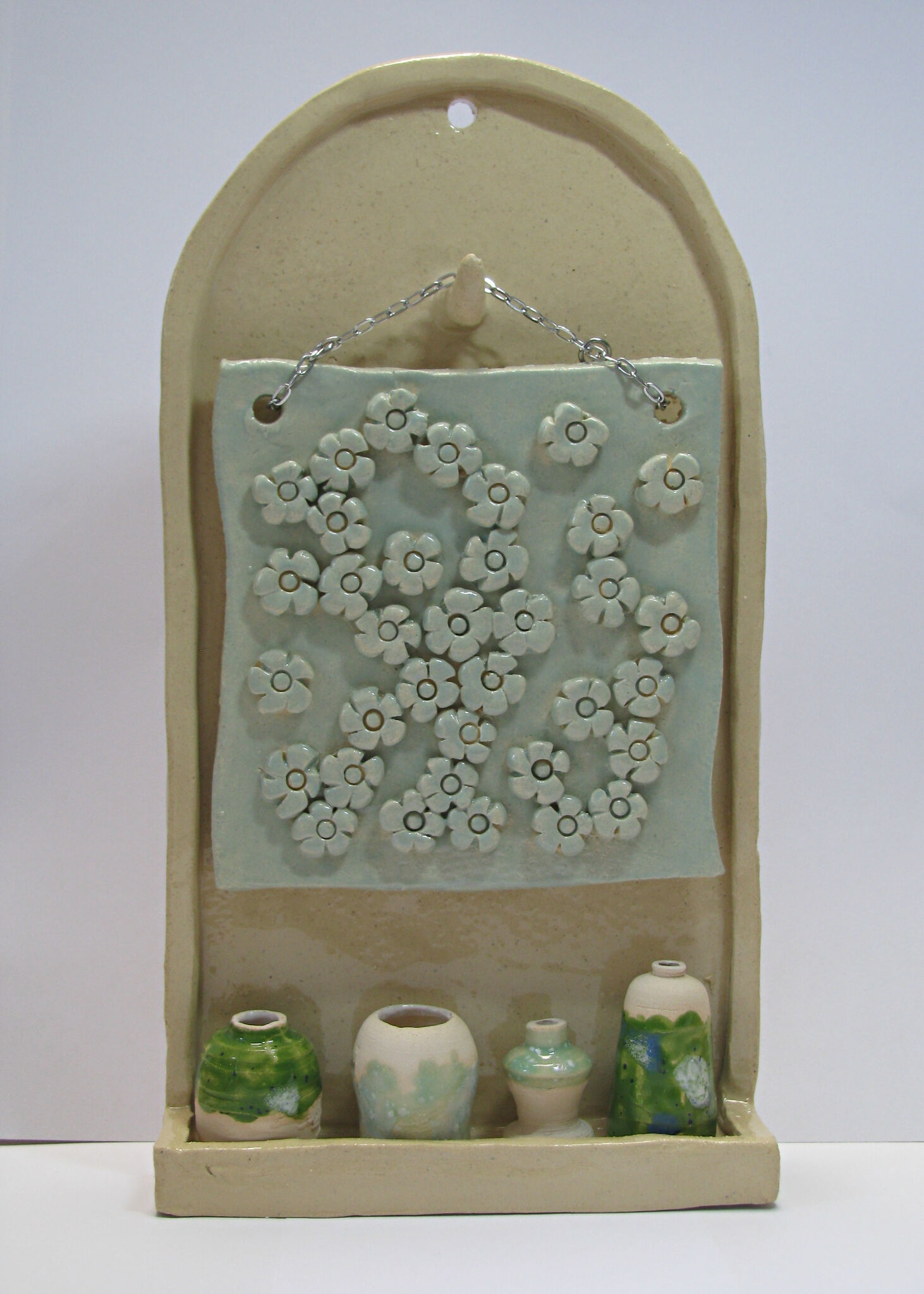 assemblage Bij voorkeur van diverse kleinere objecten, al dan niet gecombineerd met readymades. bij dit 'altaartje' zijn mijn gedraaide miniatuurvaasjes met een bloementegeltje op een handgevormde drager samengevoegd tot een wand-object.