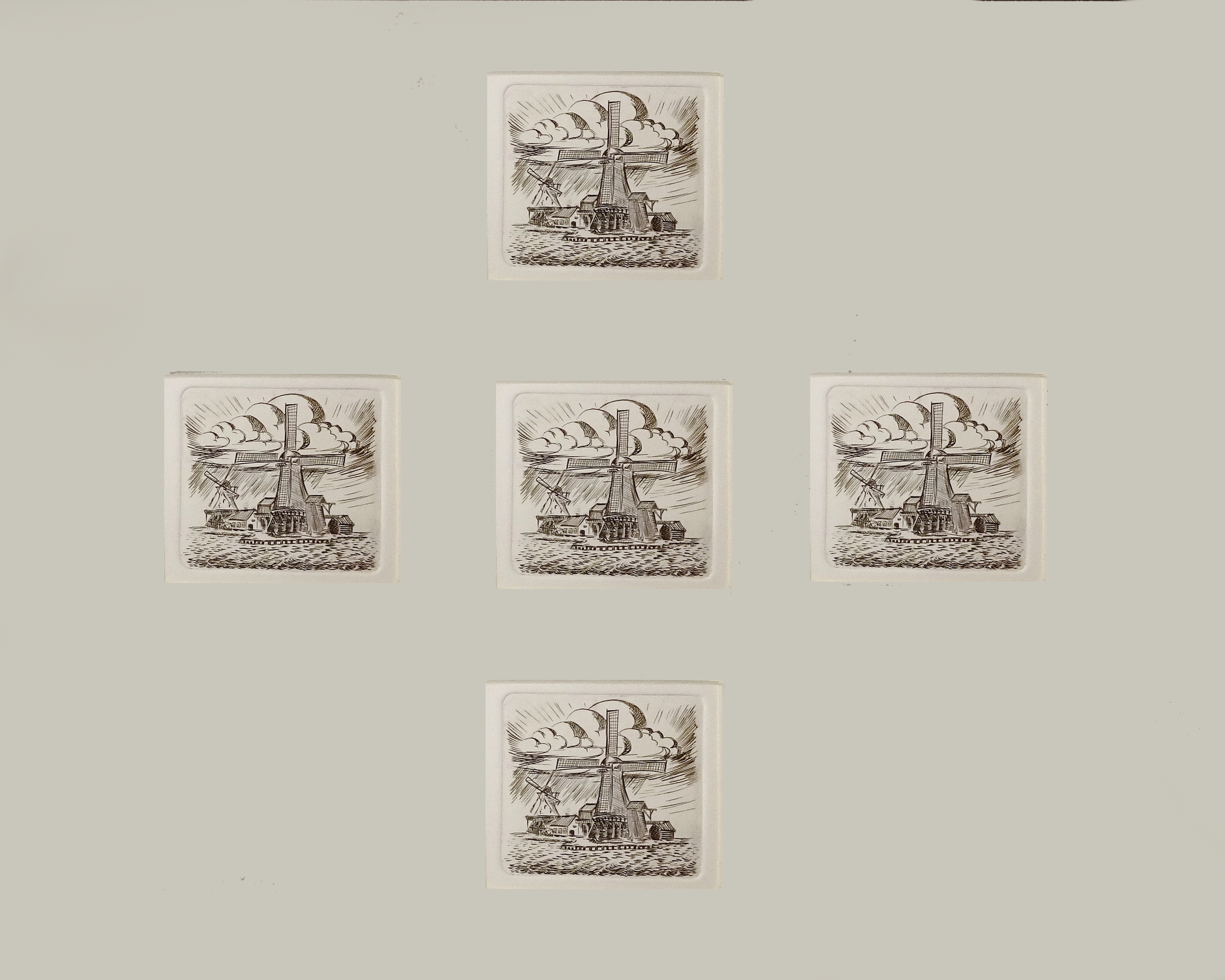 De gravure van de molens aan de Zaan is 5 maal afgedrukt en in een patroon ingelijst