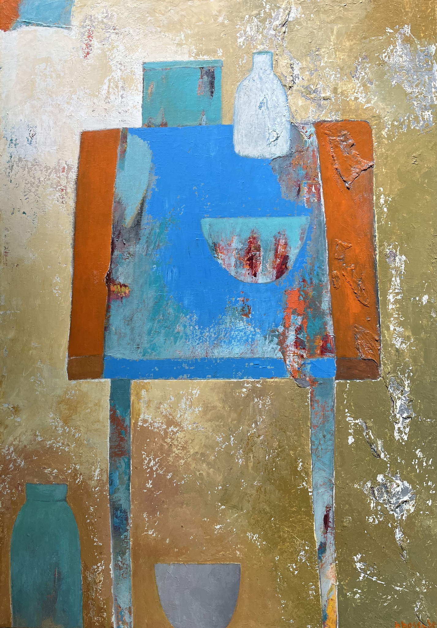 Tafel geschilderd op een bewerkte ondergrond ,wat meespeelt in het eindresultaat.
