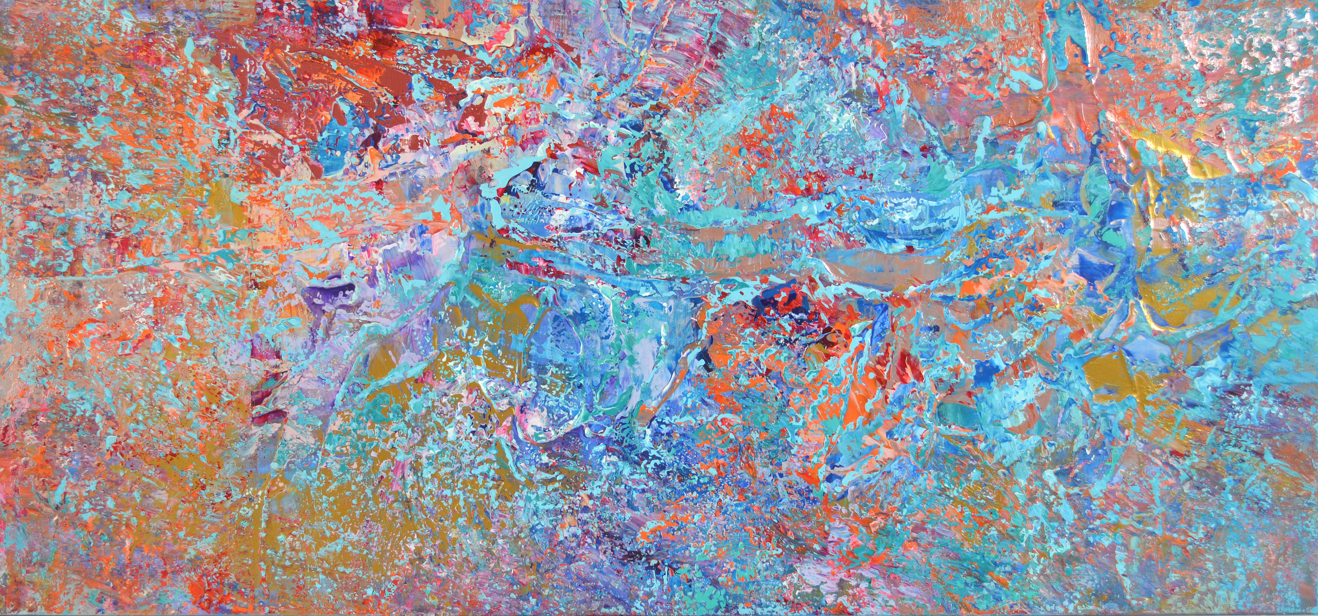 A celebration of renewal and energy, this abstract piece channels the riotous beauty of springtime in full bloom. Layers of vibrant hues—fuchsia, orange, cobalt, and deep rose—dance together in a metallic shimmer of copper, gold, and rose gold. “Spring Storm” is not a literal depiction, but an emotional response to the rush of colour, scent, and sensation that spring brings after the quiet of winter.