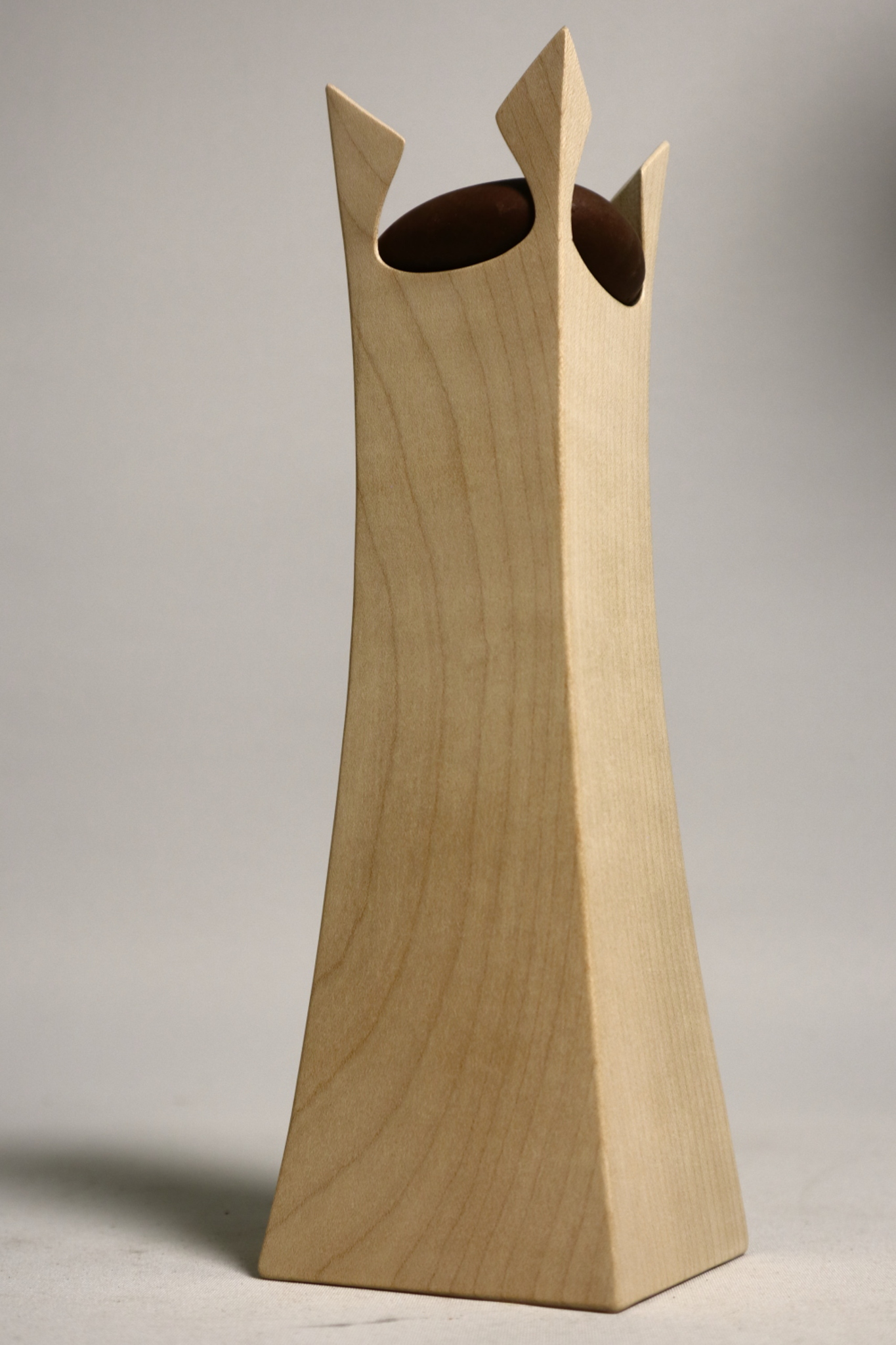 Afmeting: 7.5x7.5x26cm. materiaal: esdoorn, kei, was. techniek: houtdraaiwerk.+