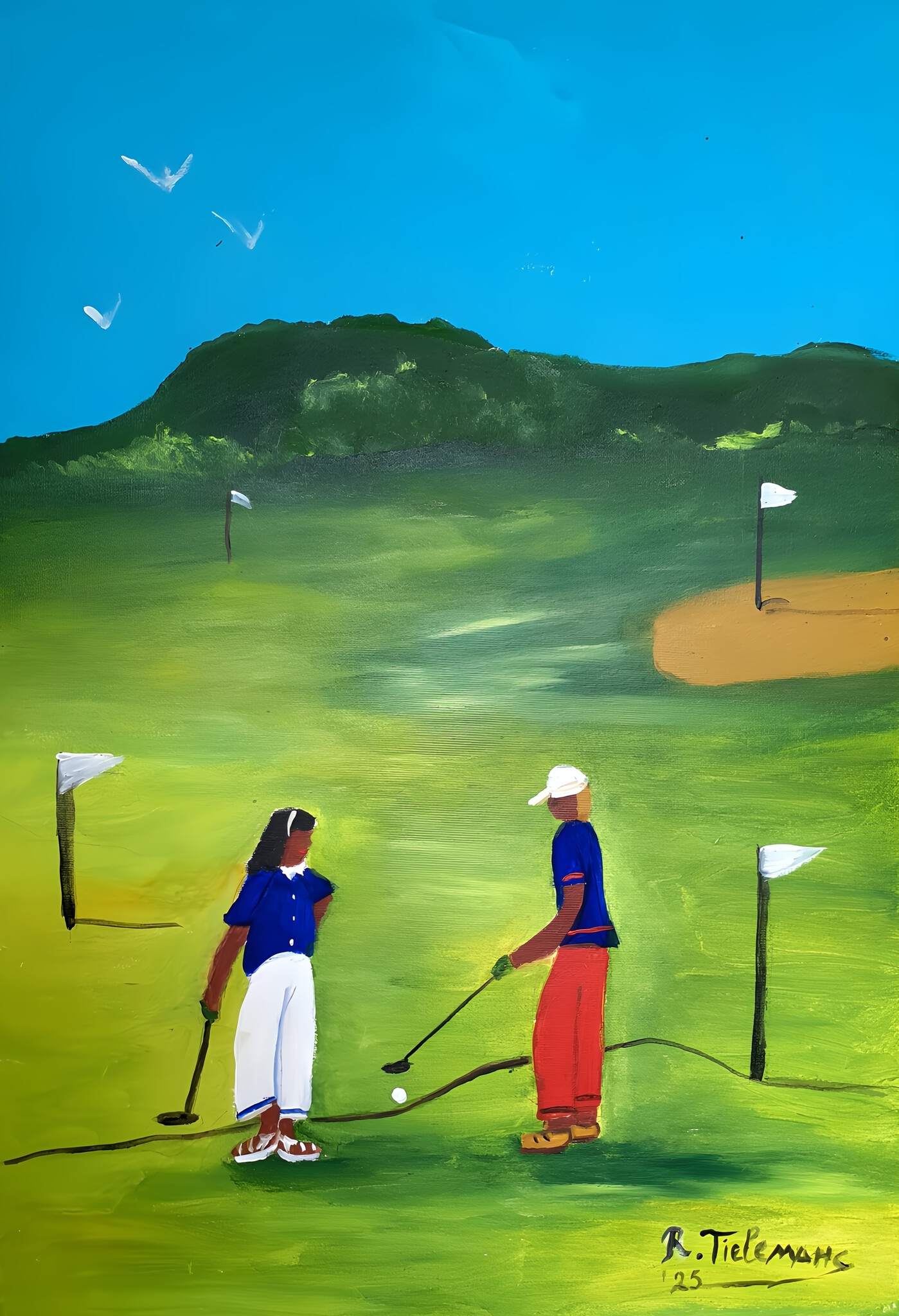 Tegen een helderblauwe lucht ligt een glooiend groen landschap. Op de voorgrond staan twee figuren met golfclubs, naast elkaar, in een moment van stilte. Witte vlaggen markeren de ruimte rondom hen. De kleuren zijn helder en vereenvoudigd, met zachte overgangen en duidelijke contouren. De compositie ademt rust en concentratie, waarbij het landschap en de figuren in evenwicht met elkaar staan. Er is ook een zorgvuldig vervaardigde kunstprint van dit werk beschikbaar.