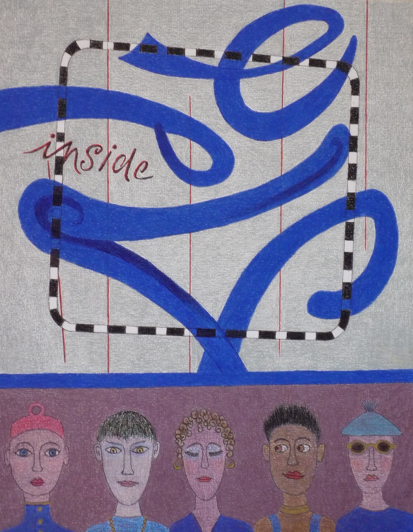 tweedelige tekening. bovenin bewegelijke vormen. onder: vijf gezichten.