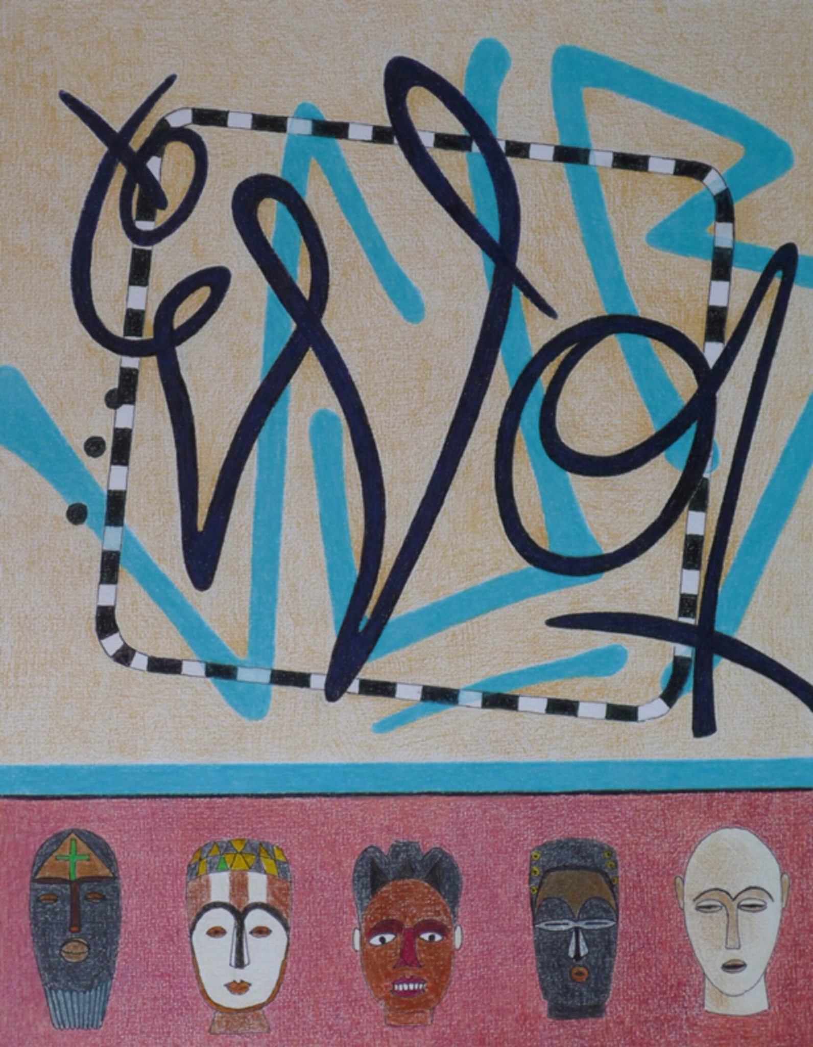 kleurpotloodtekening in twee delen. boven abstract, onder vijf gemaskerde gezichten.