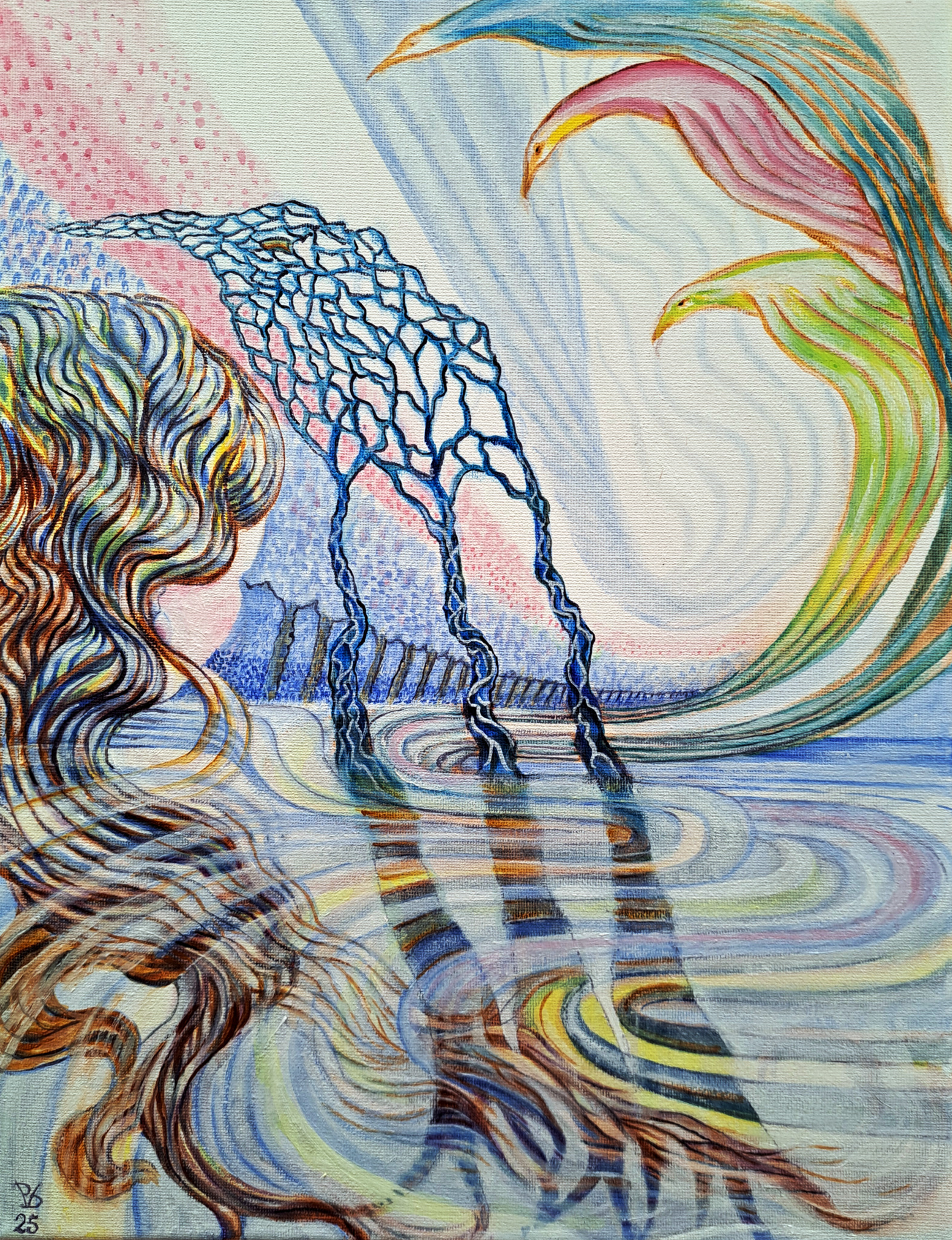 In een razend tempo is onze realiteit aan het veranderen; politiek, economisch, technisch, sociaal en nog zoveel meer. Dit werkje heet: "Unfolding" ofwel de ontplooiing van (een) realiteit. Ieder ervaart de ontwikkelingen en realiteit(en) op geheel eigen wijze. Hier mijn poging om dat in beeld te vangen. De bomenrij staat voor de tijdlijn; en de drie bomen (ik noem ze graag: Geloof, Hoop en Liefde) die onze mentaliteit weergeven, en het overal golvende, doorlopende haar. En de vogels; die staan voor vrijheid, ondernemingslust en onafhankelijkheid met ieder in hun eigen kleur!