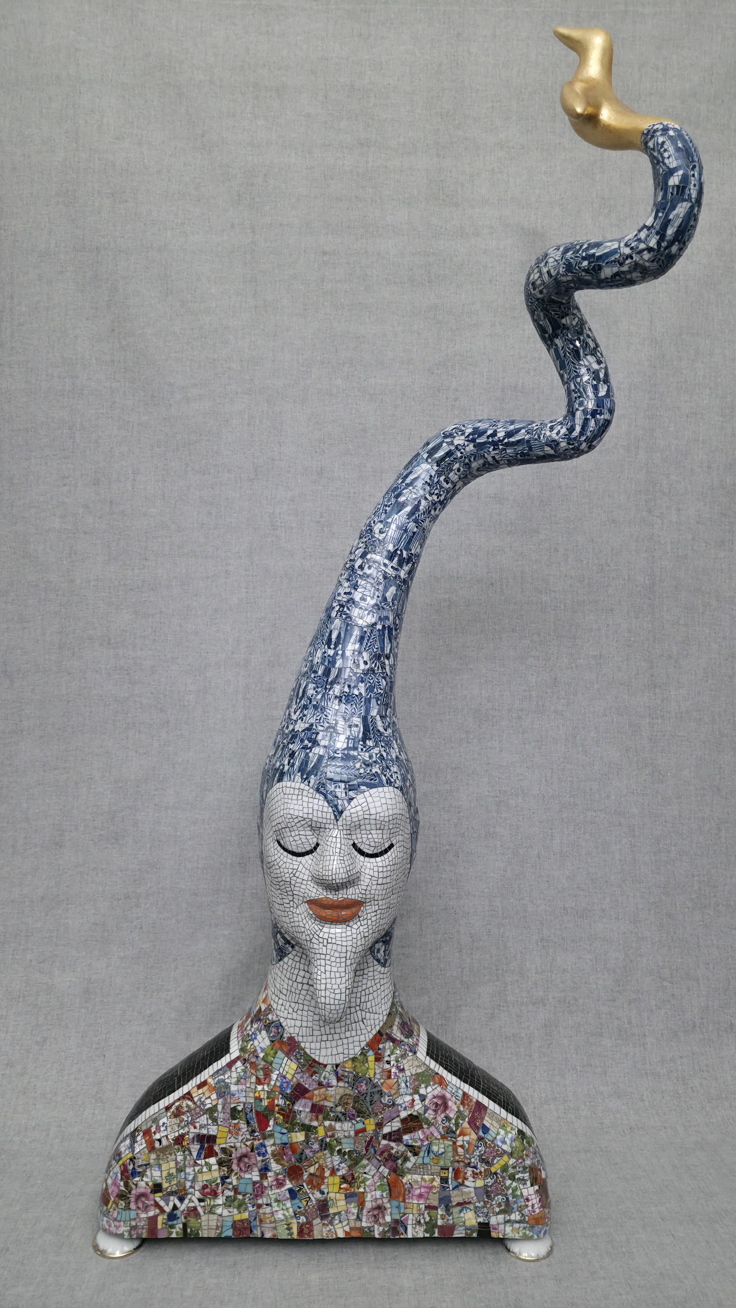 Opnieuw een porselein sculptuur met een " vreemd hoofddekse l" De vogel aan is belegd met " bladgoud " Deze sculptuur staat op VIER porseleinen voetjes van roomkannetjes. Incl. de 3 porseleinen oortjes en initialen WA. Deze sculptuur is TE KOOP !