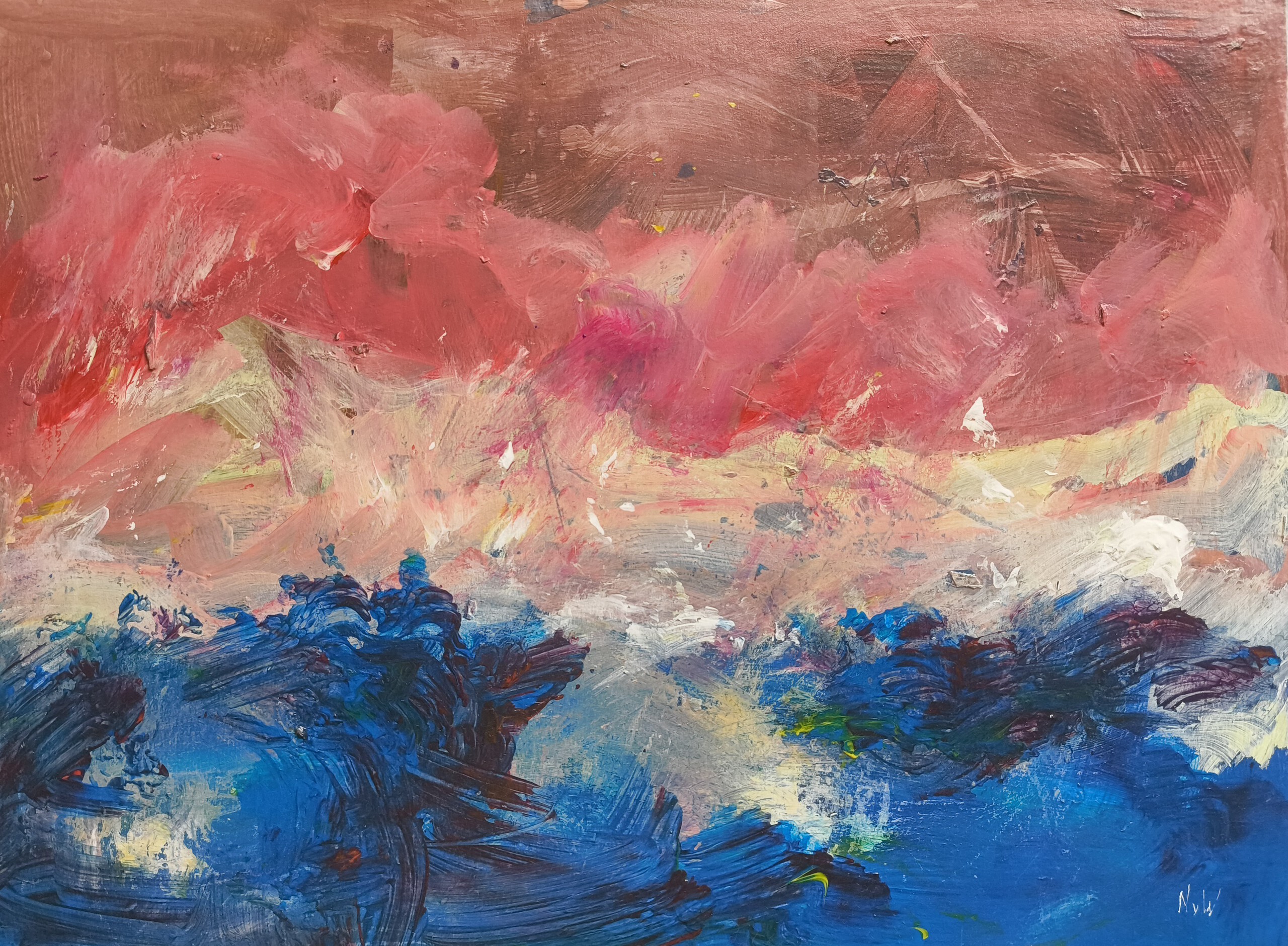Schilderij uitgaande van de Nederlandse driekleur. Een vrije vorm om ruimte te geven aan innerlijke dynamiek en persoonlijke expressie. Gemaakt op schilderkarton.