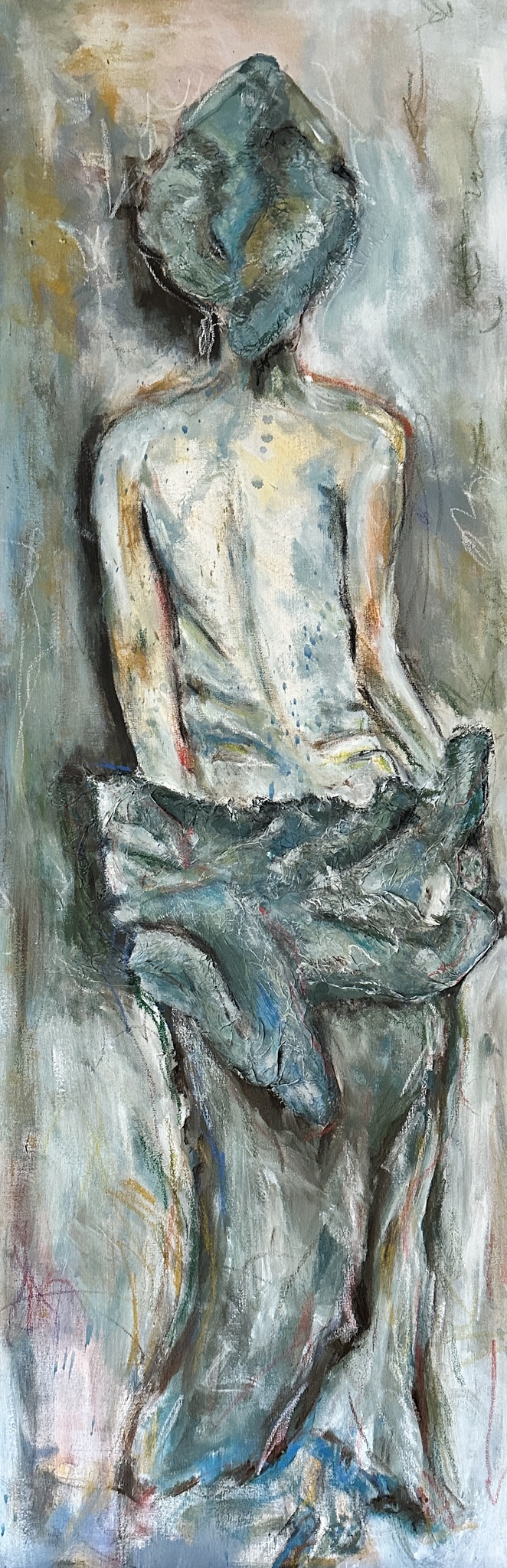 Een achteraanzicht van een menselijk figuur, het hoofd gewikkeld in een handdoek. Het roept een moment van stilte op. De expressieve penseelvoering en textuur verterken een gevoel van vervreemding en anonimiteit. In de zachte koele tinten schuilt zowel kwetsbaarheid als verstilling."In Stilte gehuld" nodigt uit tot reflectie. Het vervaagde kleurenpalet en de ruwe texturen versterken het gevoel van ongrijpbaarheid. Wat zichtbaar is voelt verborgen. Wat kwetsbaar lijkt, draagt ook kracht. Une silhouette humaine vue de dos, la tête enveloppée dans une serviette. Elle évoque un moment de silence. Le coup de pinceau expressif et la texture renforcent le sentiment d'aliénation et d'anonymat. Les tons doux et froids dissimulent à la fois vulnérabilité et immobilité. « Vêtu de silence » invite à la réflexion. La palette de couleurs délavées et les textures brutes renforcent le sentiment d'insaisissabilité. Ce qui est visible semble caché. Ce qui paraît vulnérable est aussi porteur de force.
