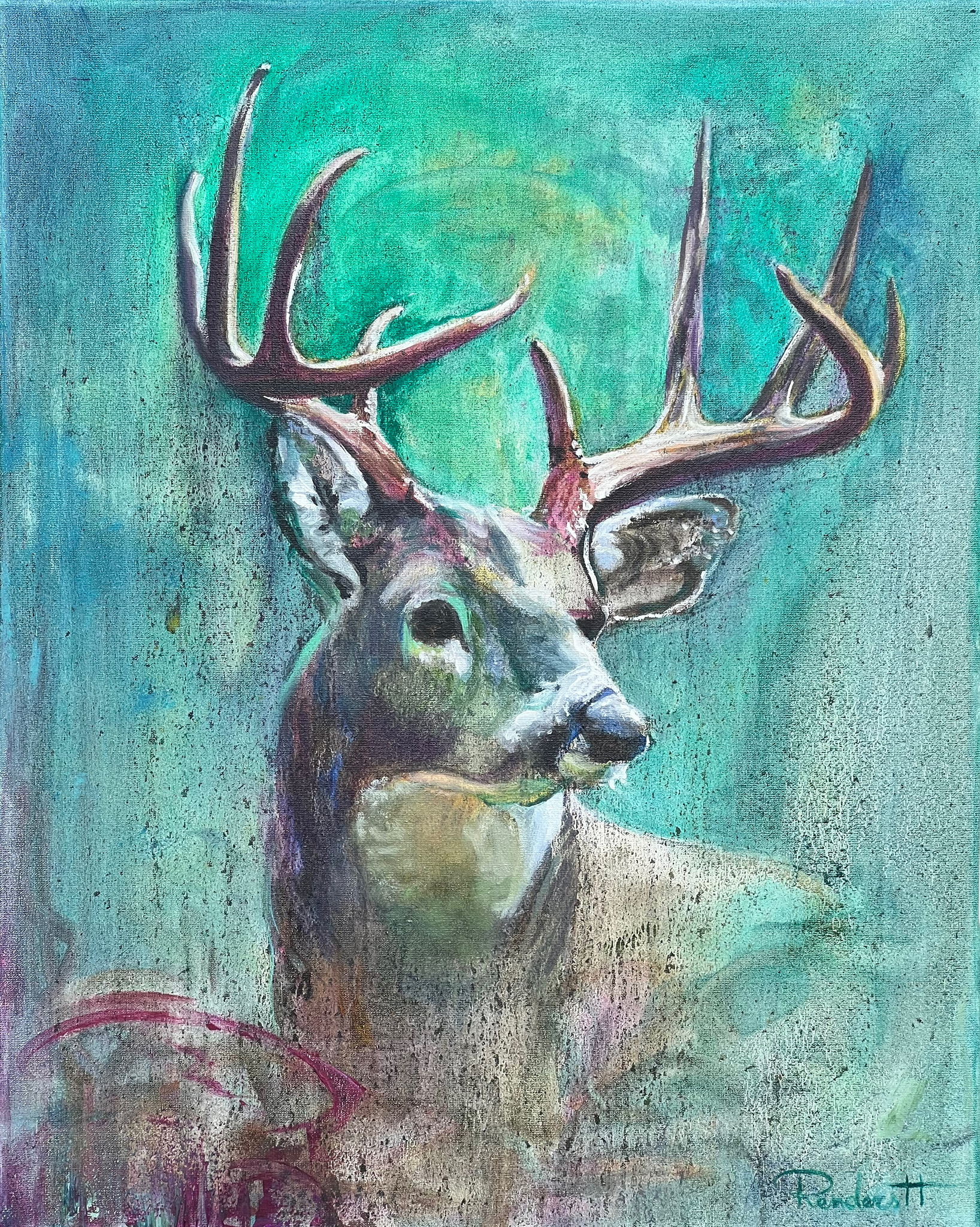 Sommige ontmoetingen zoek je niet - ze vinden jou. Een plotselinge stilte. Het gevoel dat je wordt bekeken. Niet door een mens, maar door iets dat ouder is dan taal. Wilder. Dit hertachtige wezen verscheen in mijn werk zoals het in een bos zou kunnen verschijnen: geluidloos, zonder waarschuwing, met een blik die niets vraagt, maar alles zegt. Het raakte iets in mij aan. Verwondering misschien. Of het gevoel dat er even een sluier opzij schoof tussen werelden - en ik mocht meekijken. Ik schilderde het niet als symbool of verhaal. Ik schilderde het als een echo van dat ene moment: wanneer de tijd stilvalt, en iets wat er altijd al was je aankijkt. Mijn werk is geen bestemming. Het is een doorgang