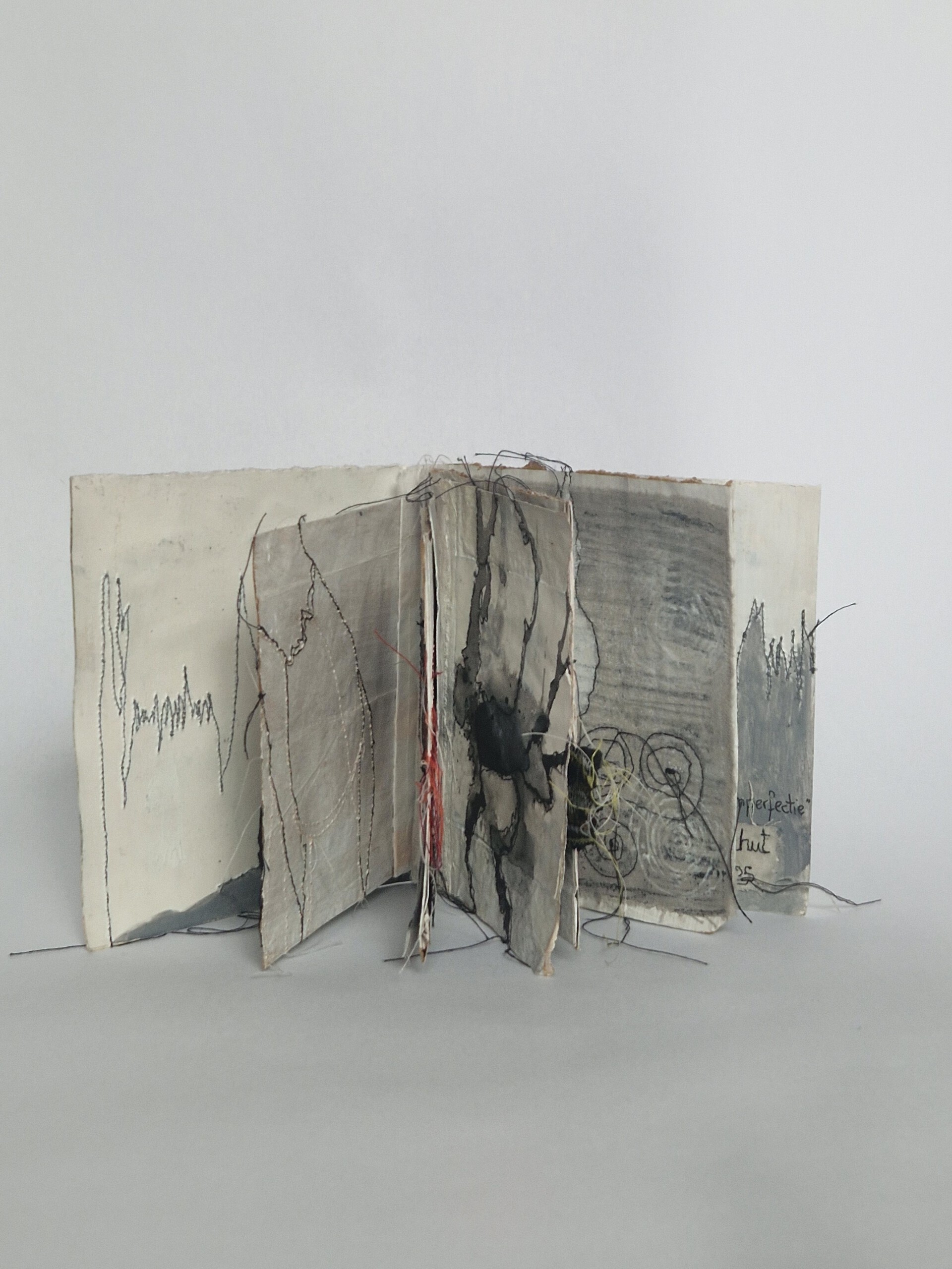 Opzet van dit boekje is grafisch. Papier, verf, machinaal borduurwerk