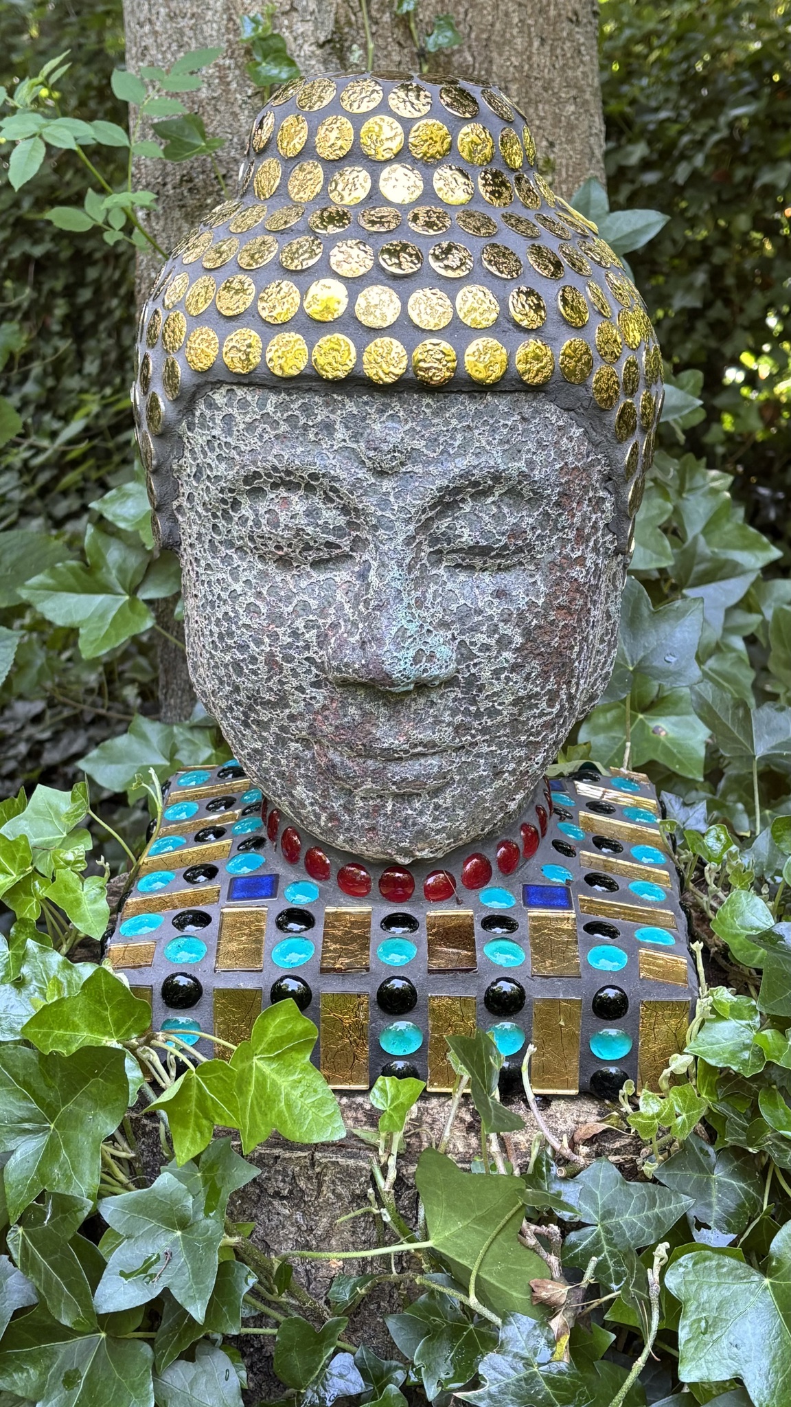Boeddha hoofd bewerkt met keramiek en glas.
