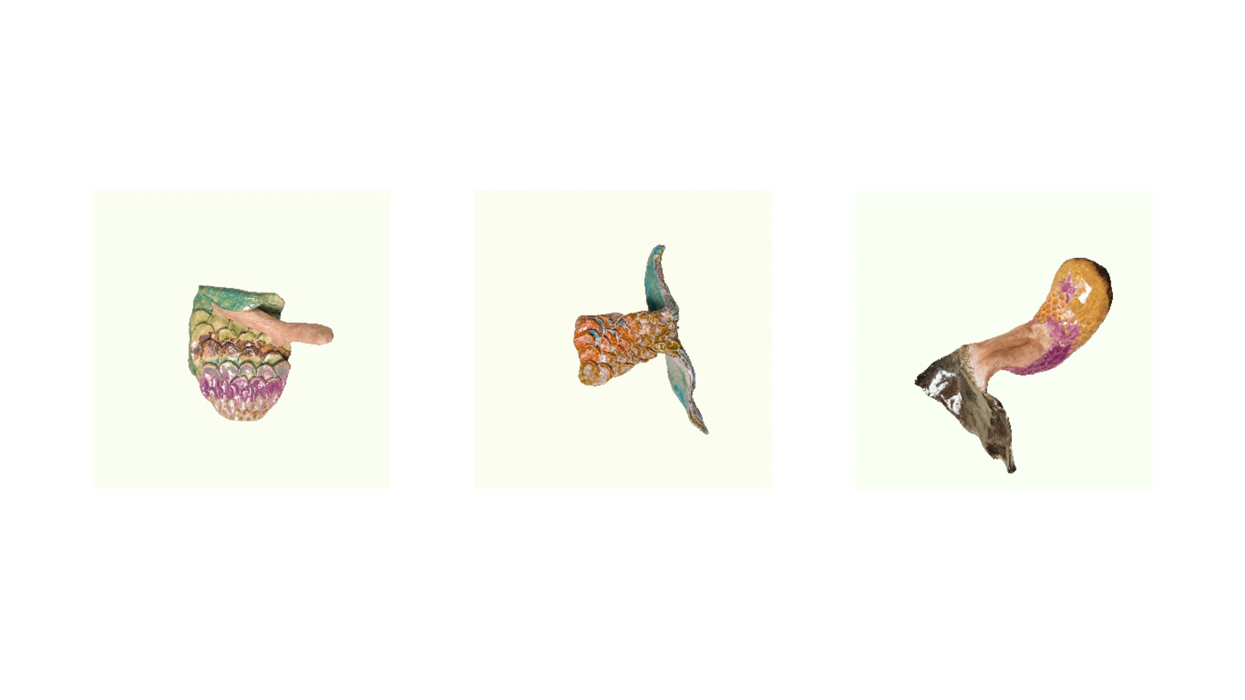 Oorspronkelijk ontstaan als teststukken, groeiden deze drie miniatuurbeelden uit tot zelfstandige kunstwerken. Elk paneel toont een ander fragment van een mythisch verhaal – als echo’s uit een vergeten legende. I. Remaining Tail II. Swallowed by the Dream III. Memory in Scales keramiek bevestigt op houten paneel 3x 20x20cm