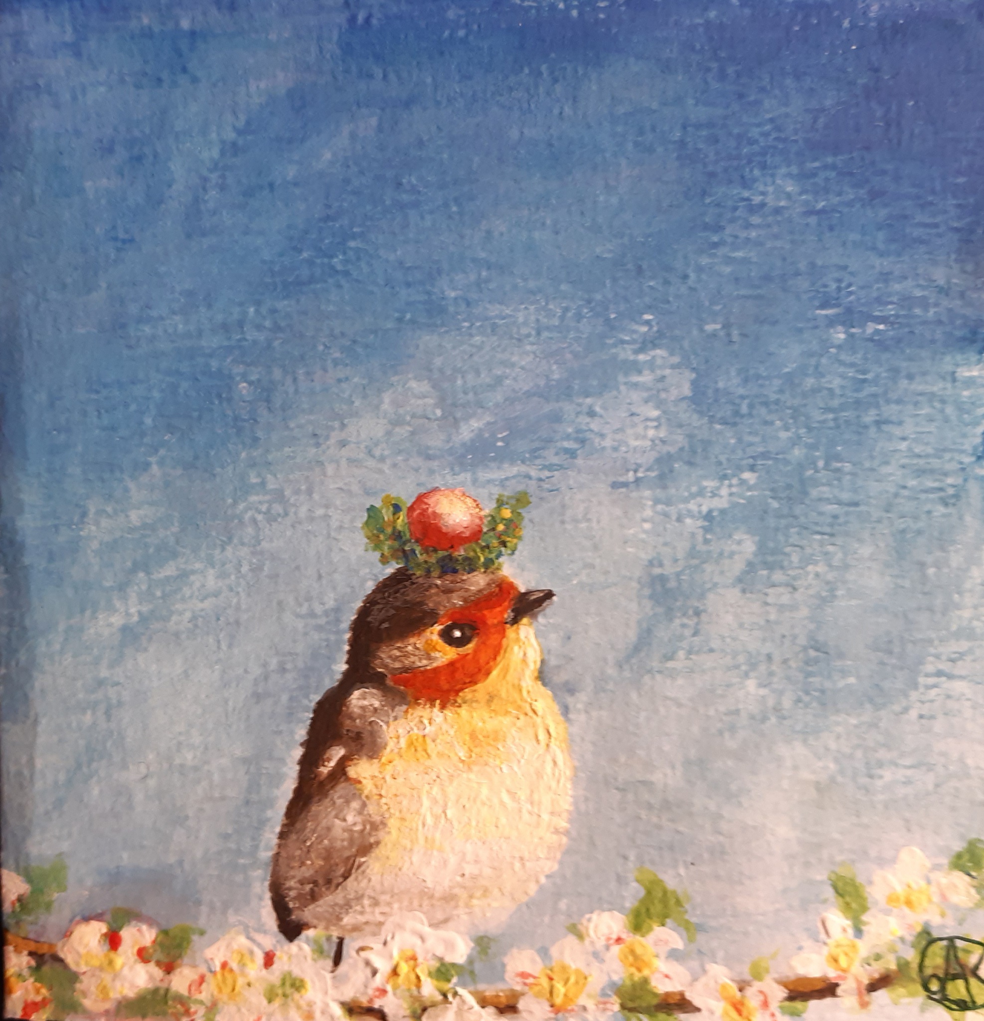 Een kerstkaart. Vogeltje, kerstbal op de kop: logisch toch?