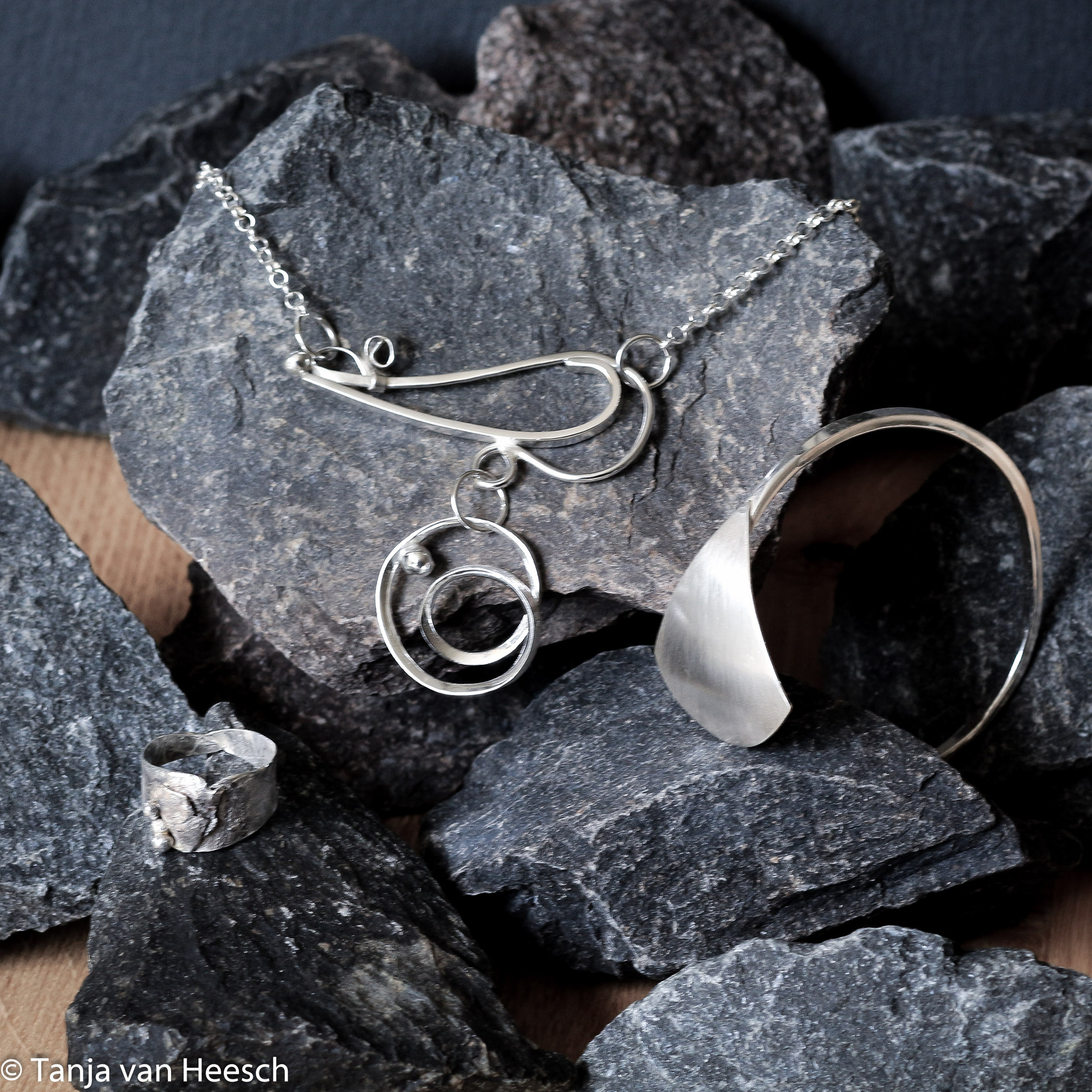 Sieraden en foto's van Tanja van Heesch. Uitgangspunt bij mijn sieraden is de fascinatie voor het materiaal, meestal zilver. Foto's rond thema's beweging en verstilling, zowel zwartwit als kleur.