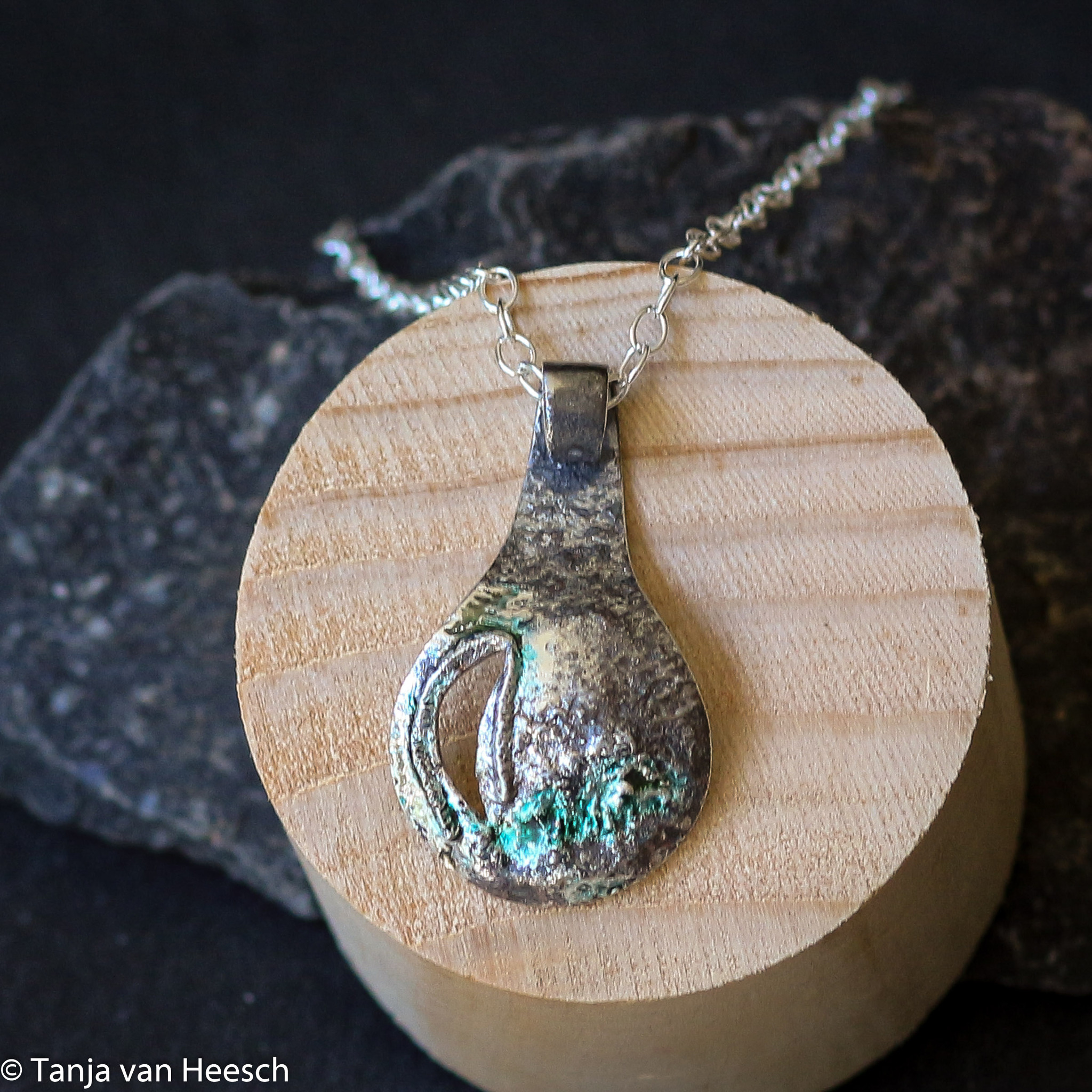 Hanger in druppelvorm van deels gesmolten en geoxydeerd zilver. (Prijs is voor de hanger, zonder ketting.)