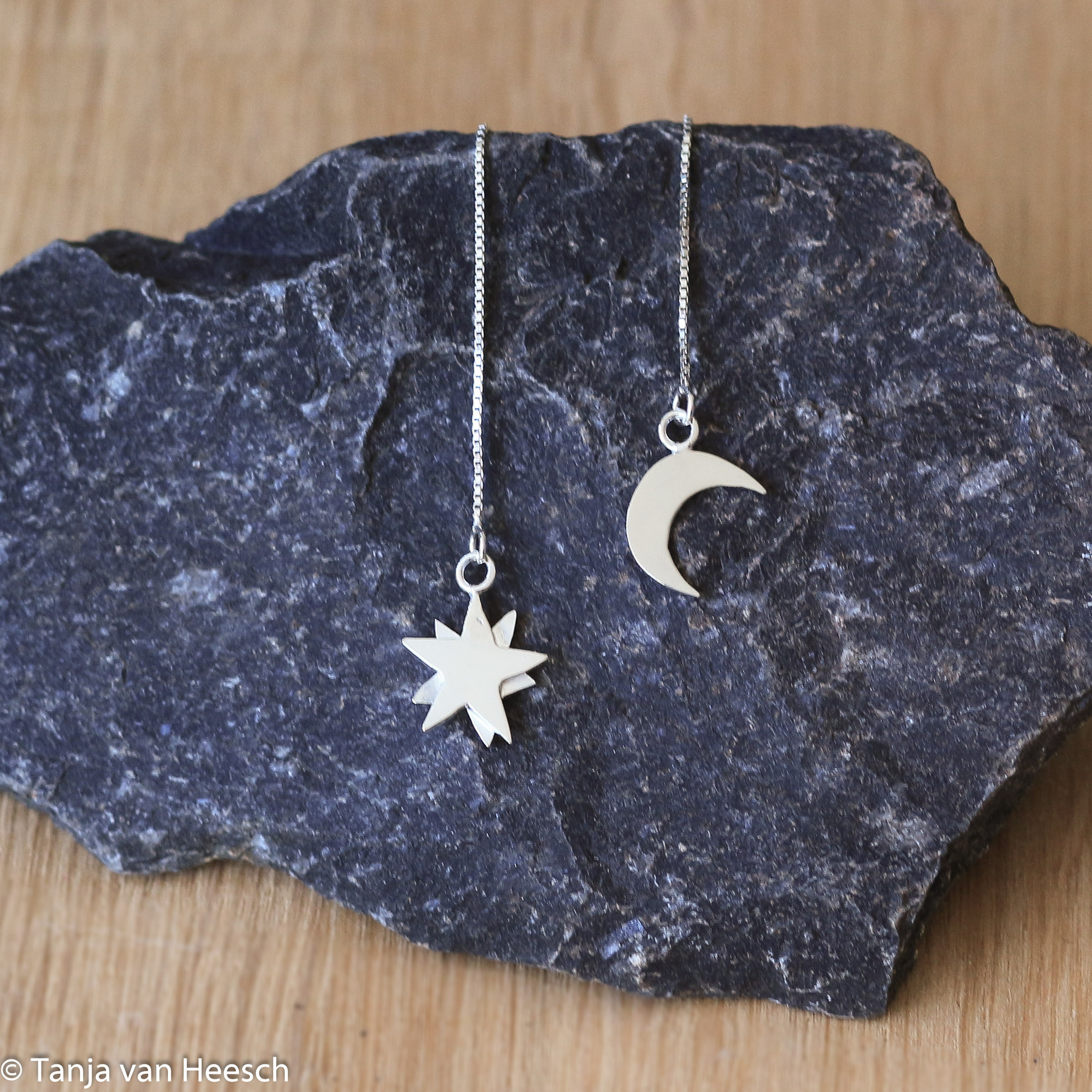 Zilveren oorhangers maan en ster.
