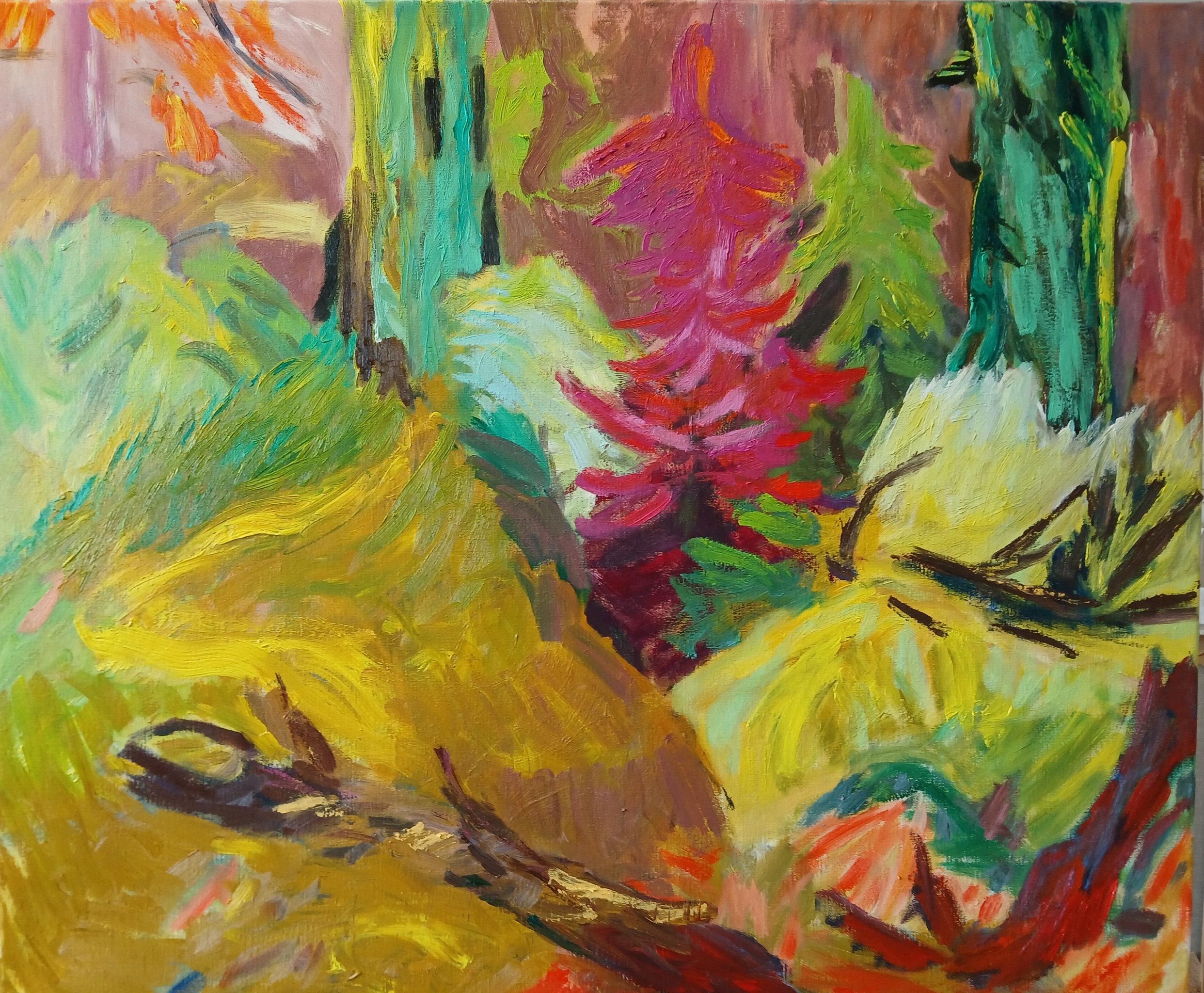 Sophie Bekkering toont in haar schilderijen en keramiek de grootse natuur. Begonnen vanuit wandelingen door de Gelderse bossen is ze inmiddels de bomen nagereisd tot aan en over de boomgrens. De ongerepte alpine ruimte waarin bomen, rotsen en water figureren.is haar speelveld.In haar schilderijen verbeeldt ze de onderliggende krachten van deze stille omgeving door middel van haar expressieve toetsen en levendige kleurcontrasten.