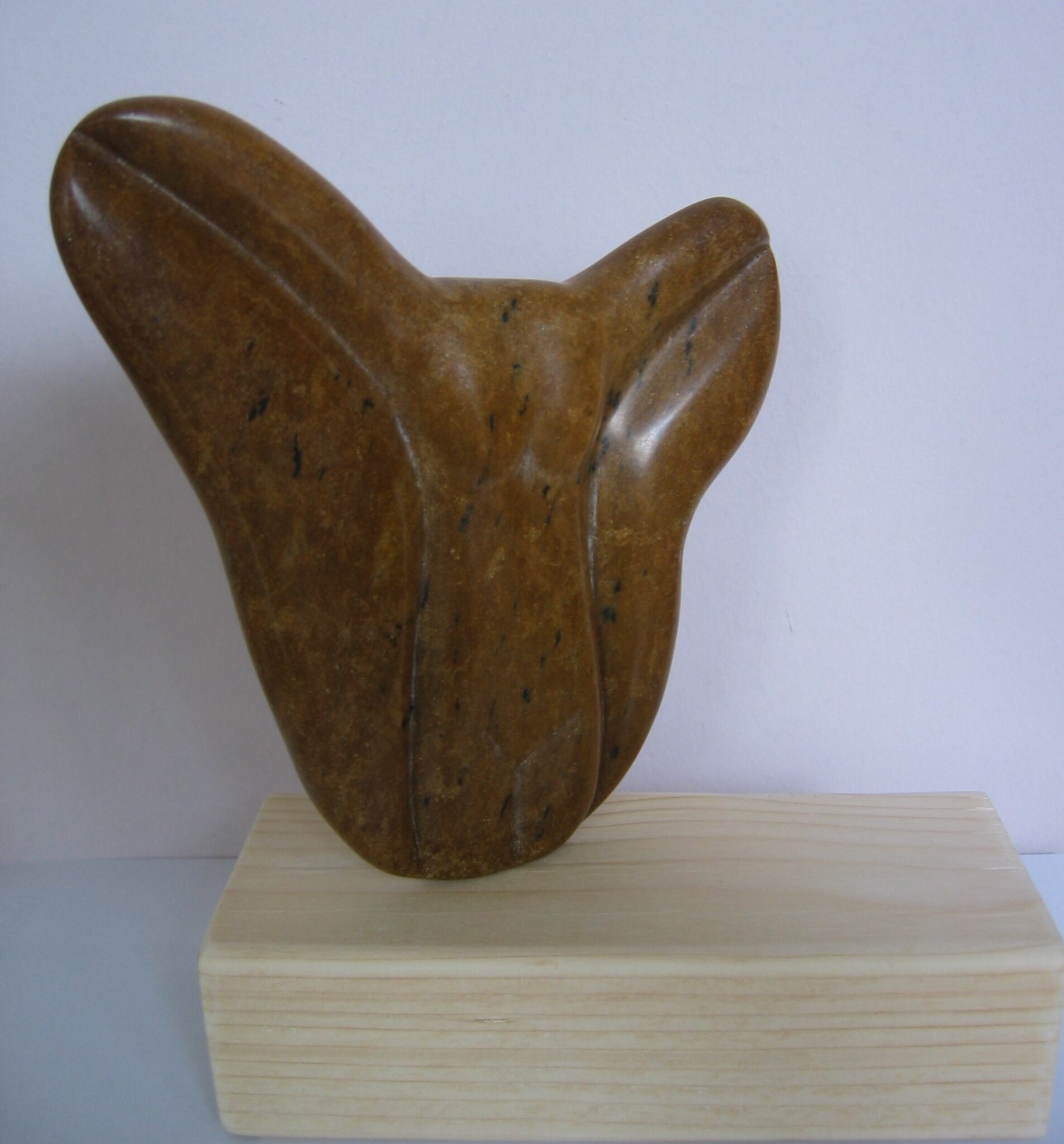 Bruin beeldje van Braziliaans speksteen op een houten sokkel.