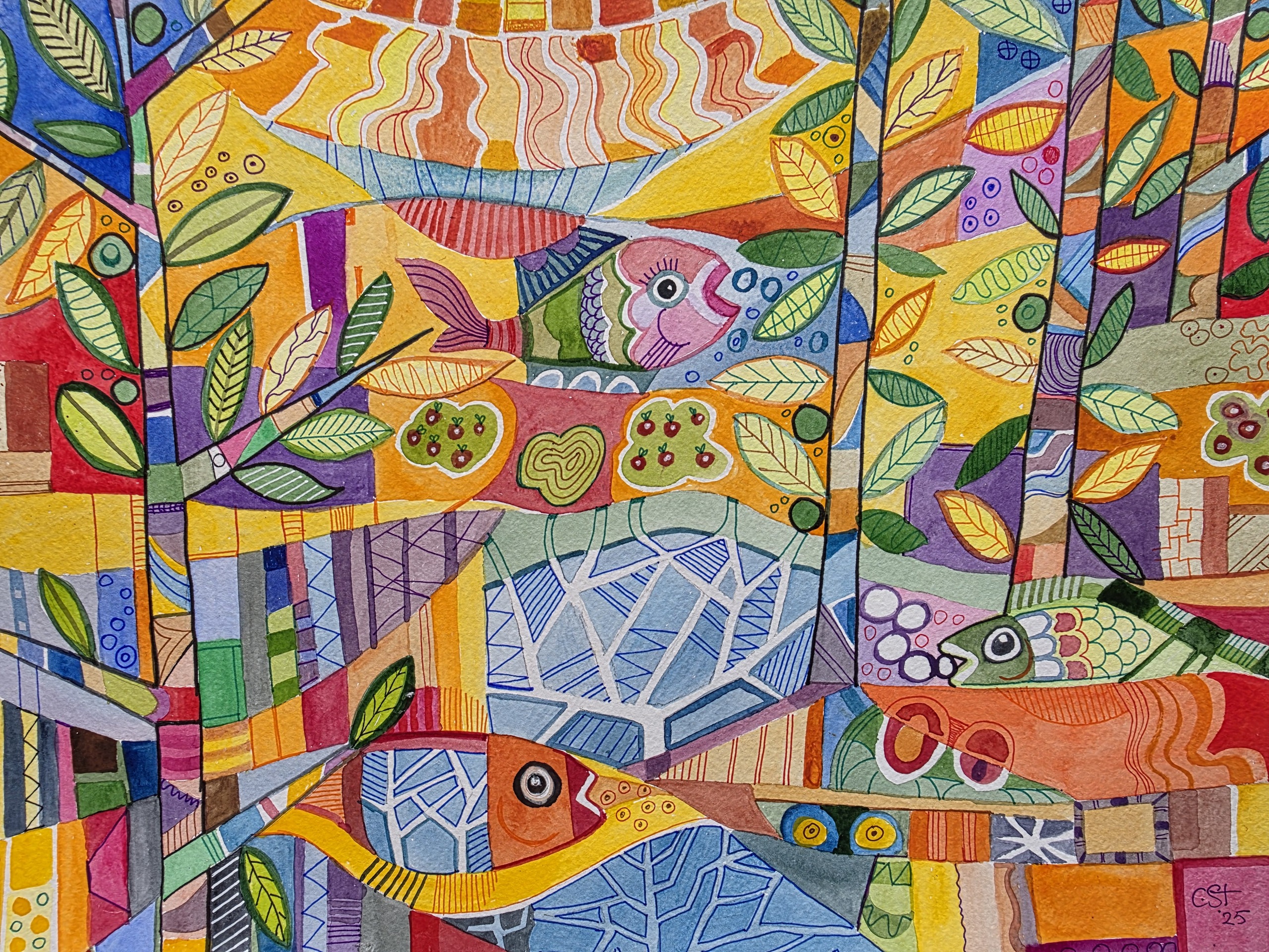 Doodle Veel Kleuren Aquarel Bomen Vissen Zon