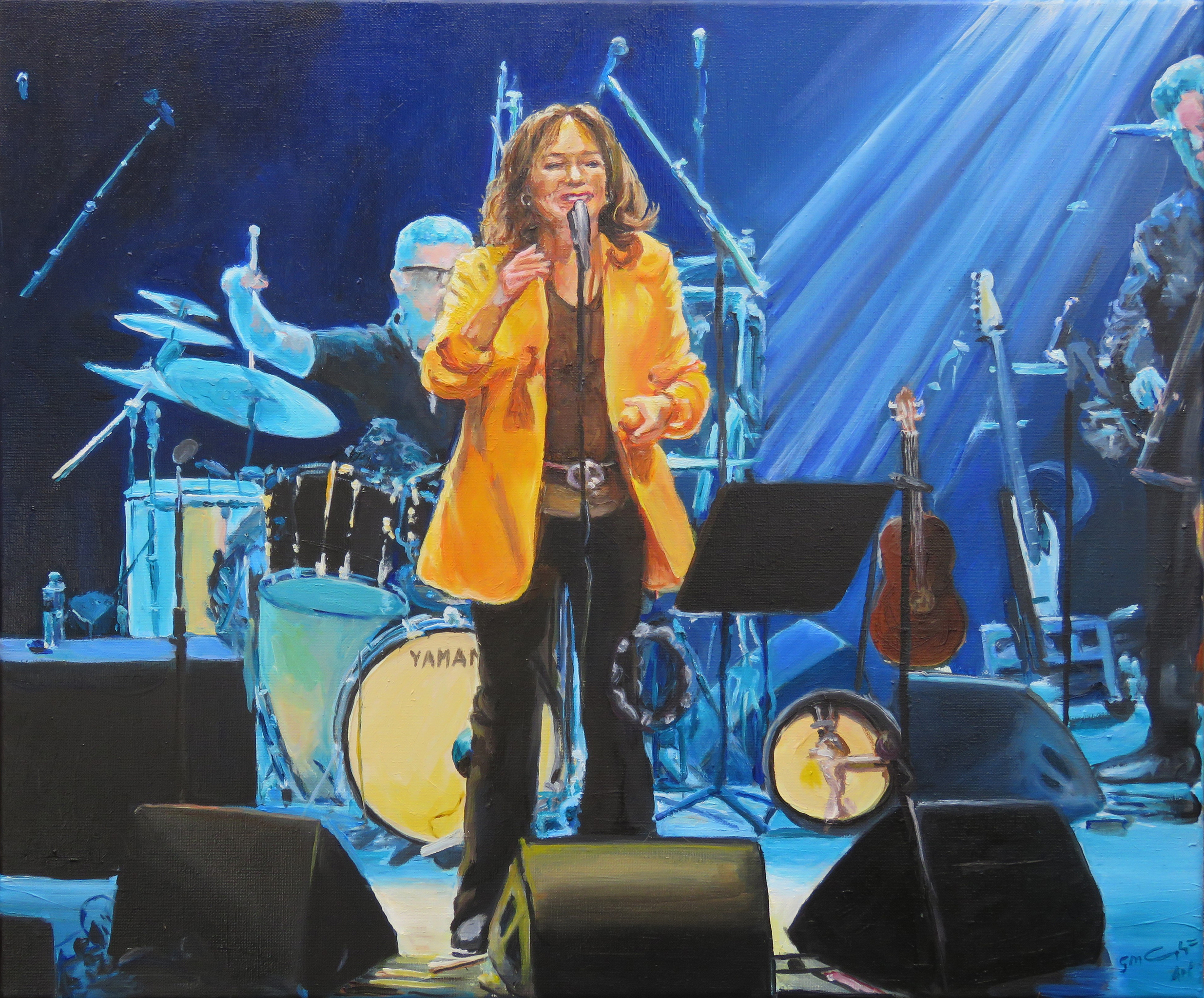 Mary Black in Utrecht 2023. Jaren ken ik al haar muziek en is ze één van mijn favoriete zangeressen. Passend bij mijn stemming kon ik er altijd heerlijk in mee gaan en het optreden was geweldig. En ik dacht ook bij haar toen, ik wil dit schilderen, die sfeer, dat licht, het contrast tussen turquoise/blauw en oranje/geel. En dan kijken of ik haar persoonlijkheid op het doek krijg, zoals ze mij treft.