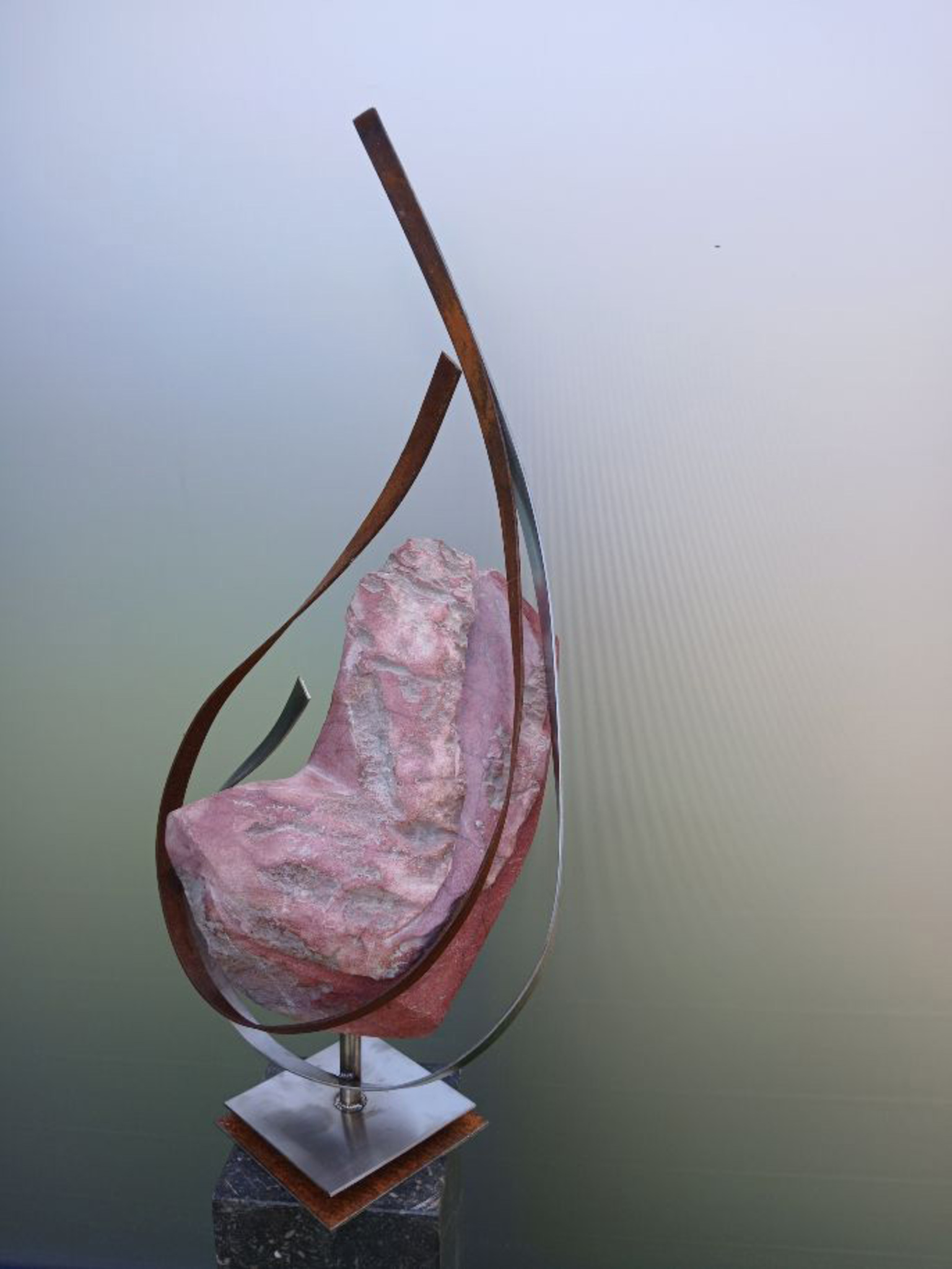 Beeld gemaakt van Parnon marmer gecombineerd met kortenstaal en RVS Liefde onstaat in de steen en het staal zet het voort de ruimte in