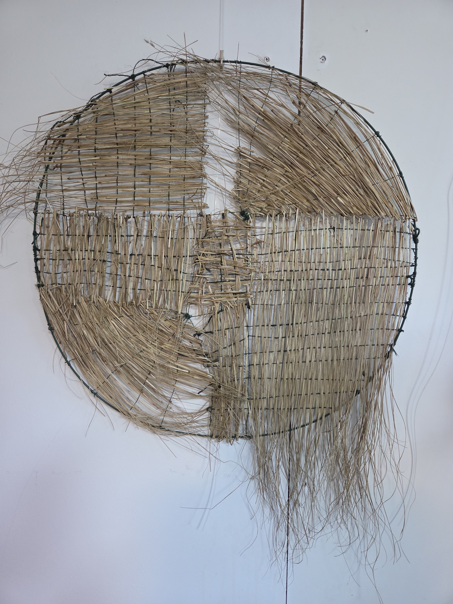 Uit de serie: Cirkels der verbeelding. Ornamental grass verwijst naar native americans die eerbied voor de natuur vanuit hun cultuur meekrijgen en een speciale grassoort helende en beschermende krachten toekennen. Ook de droomvanger staat bekend om zijn cirkel. * Tijdens de expositie Oogst van de verbeelding plaatsen 5 kunstenaars op een lange muur cirkels gemaakt met natuurlijke materialen als meanderende luchtbellen. Ik maakte er vier van. geïnspireerd op de tuin, de materialen en de heelheid van harmonie in de natuur en het universum. De cirkel is een universeel erkend symbool dat heelheid, eenheid, eeuwigheid en het oneindige vertegenwoordigt. De perfecte symmetrie wordt gezien als de belichaming van balans en harmonie. Het brengt ook symbolisch cycli en wedergeboorte over vanwege zijn ronde karakter dat geen begin of einde heeft. Vanuit spiritueel perspectief wordt de cirkel gezien als beschermend en heilig – vaak gebruikt in rituelen en ceremonies om heilige ruimtes aan te duiden. * boek: Een vlecht van Heilig gras,, Robin Wall Kimmerer