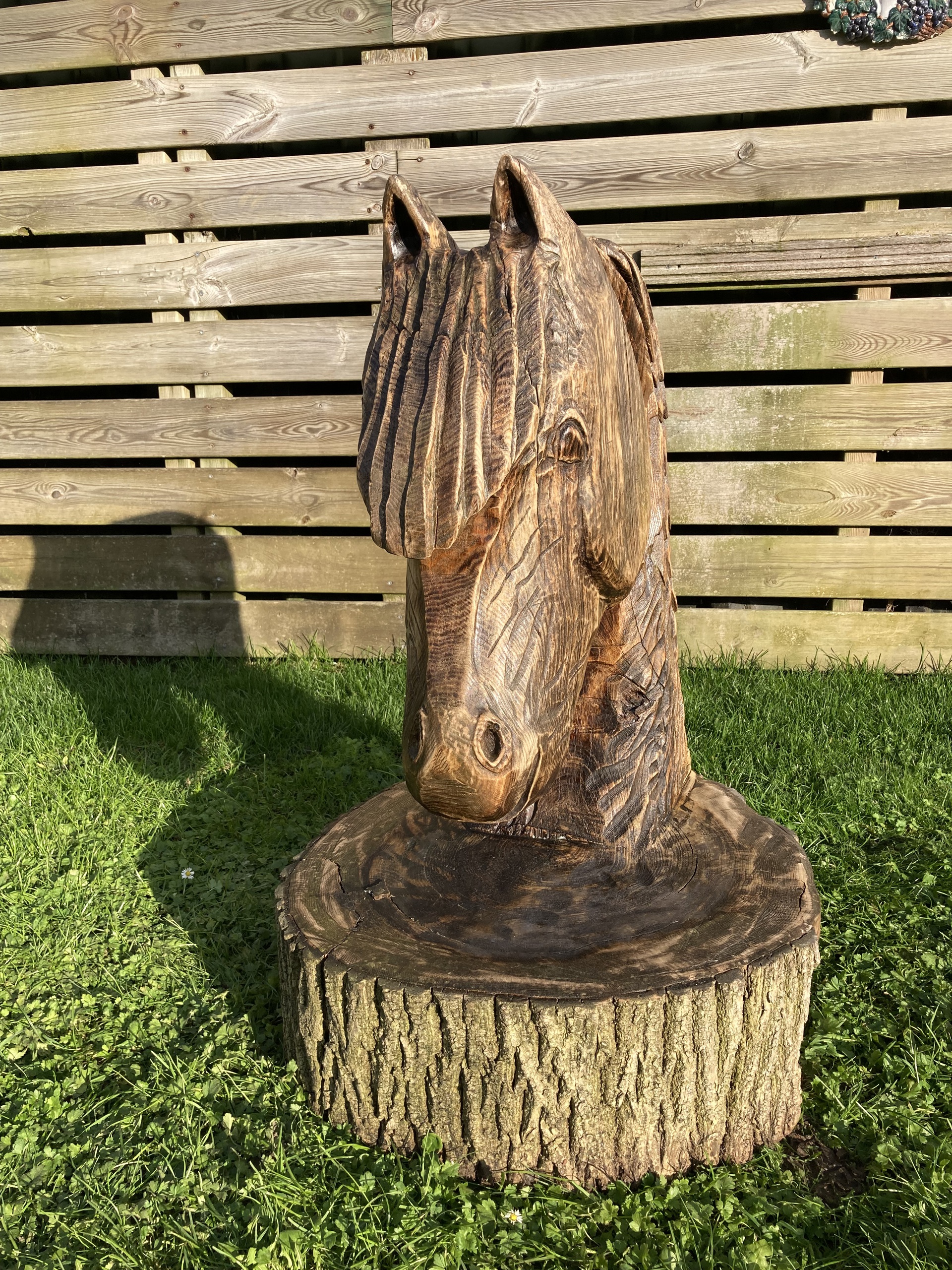 Houtenbeeld Paardenhoofd Paard Kettingzaagkunst Sculptuur Hout Boomstam Woodcarving