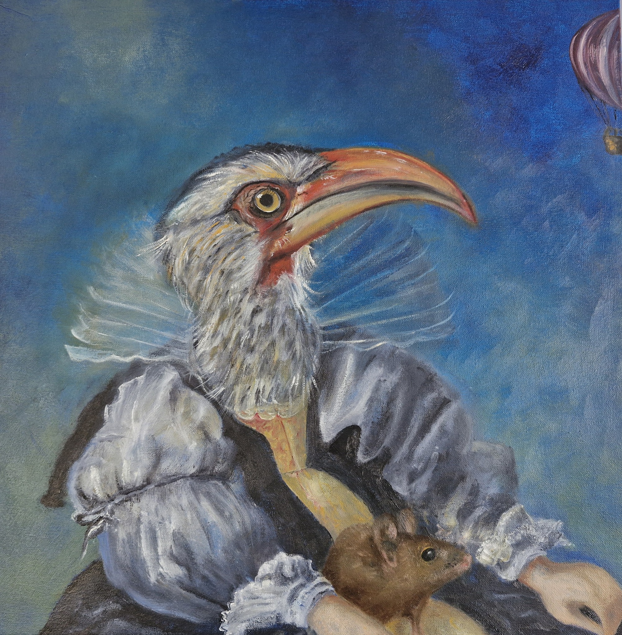 Geelsnaveltok (yellow -billedhornbill) in middeleeuwse kleding